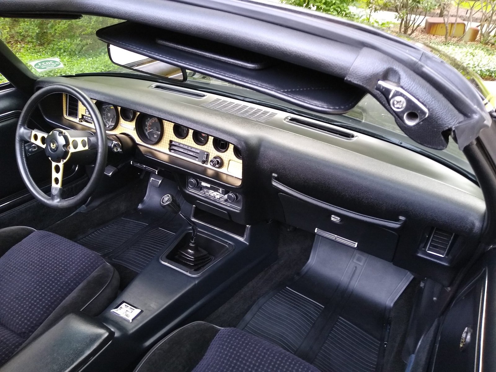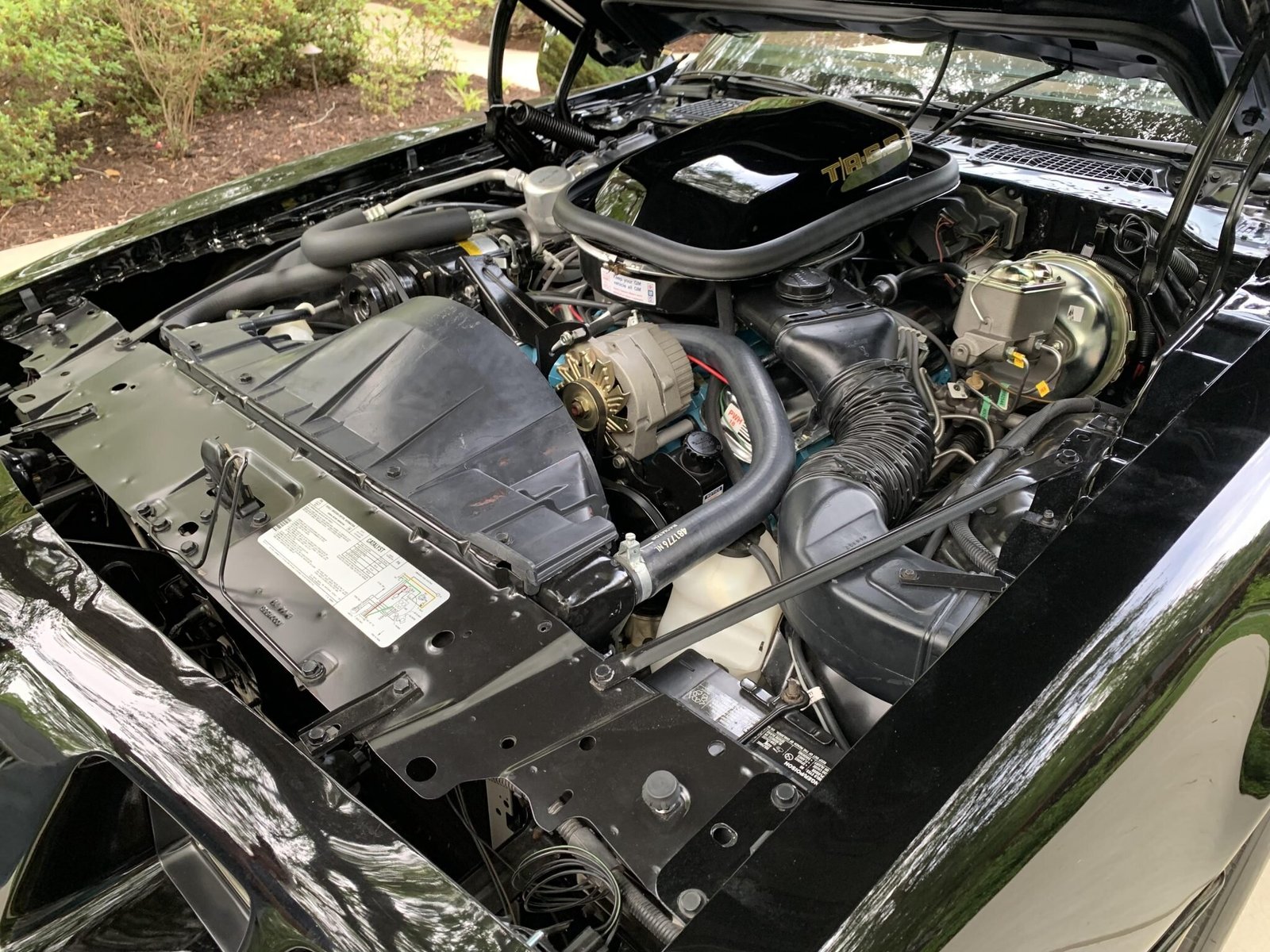 Finished from the factory in Starlight Black (19), the car was repainted and features removable T-top roof panels, gold pinstriping, a Trans Am hood decal, a shaker hood, front and rear spoilers, side moldings, quad headlights, and side-splitter exhaust outlets.