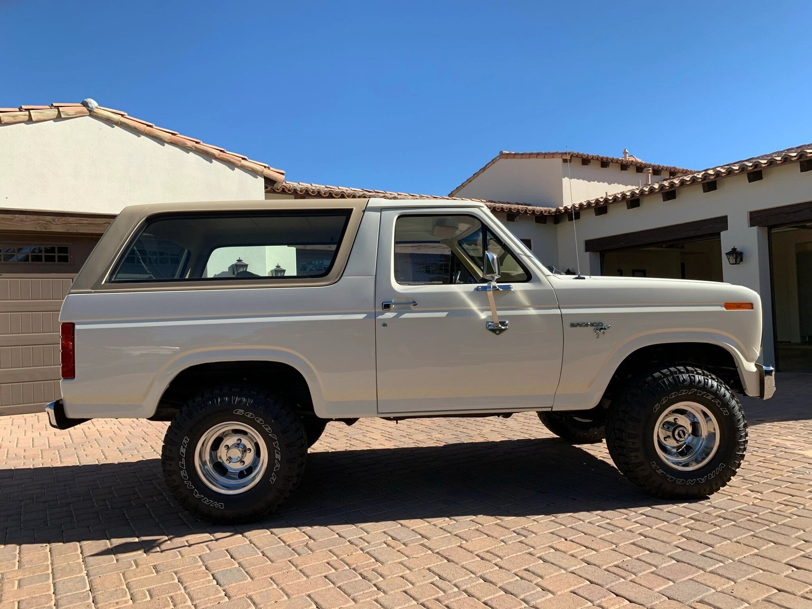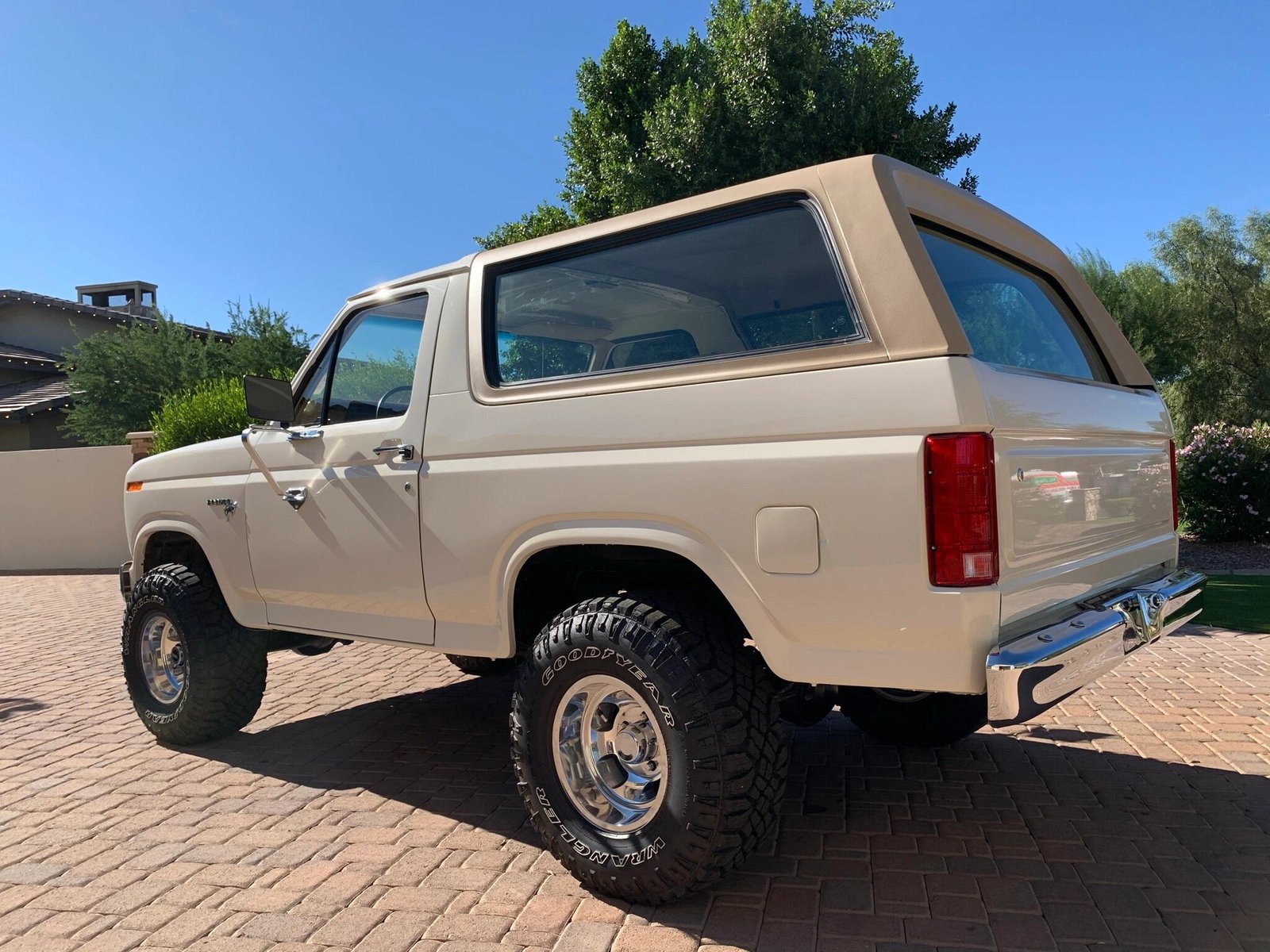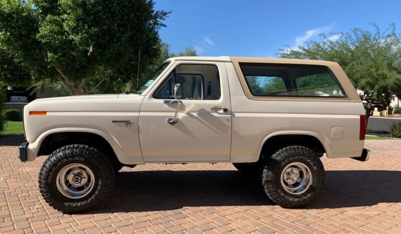 This 1980 Ford Bronco received a refurbishment that included refinishing the cream exterior, reupholstering the tan interior, replacement of glass, and overhauls of the engine, brakes, and suspension systems.