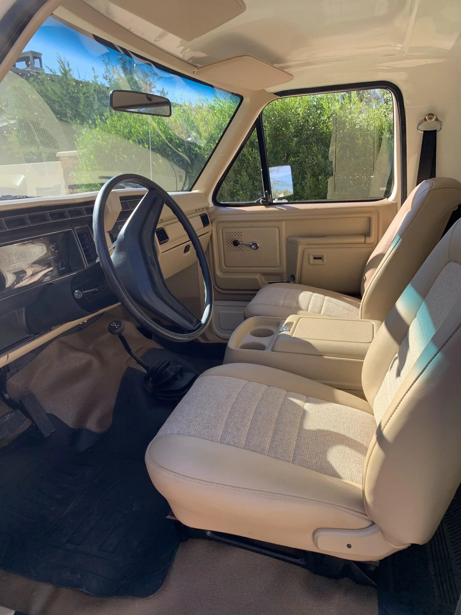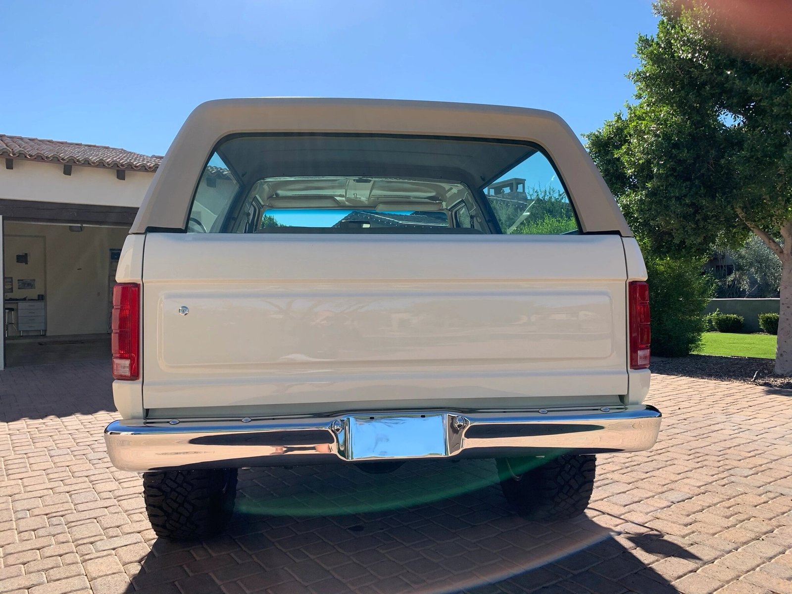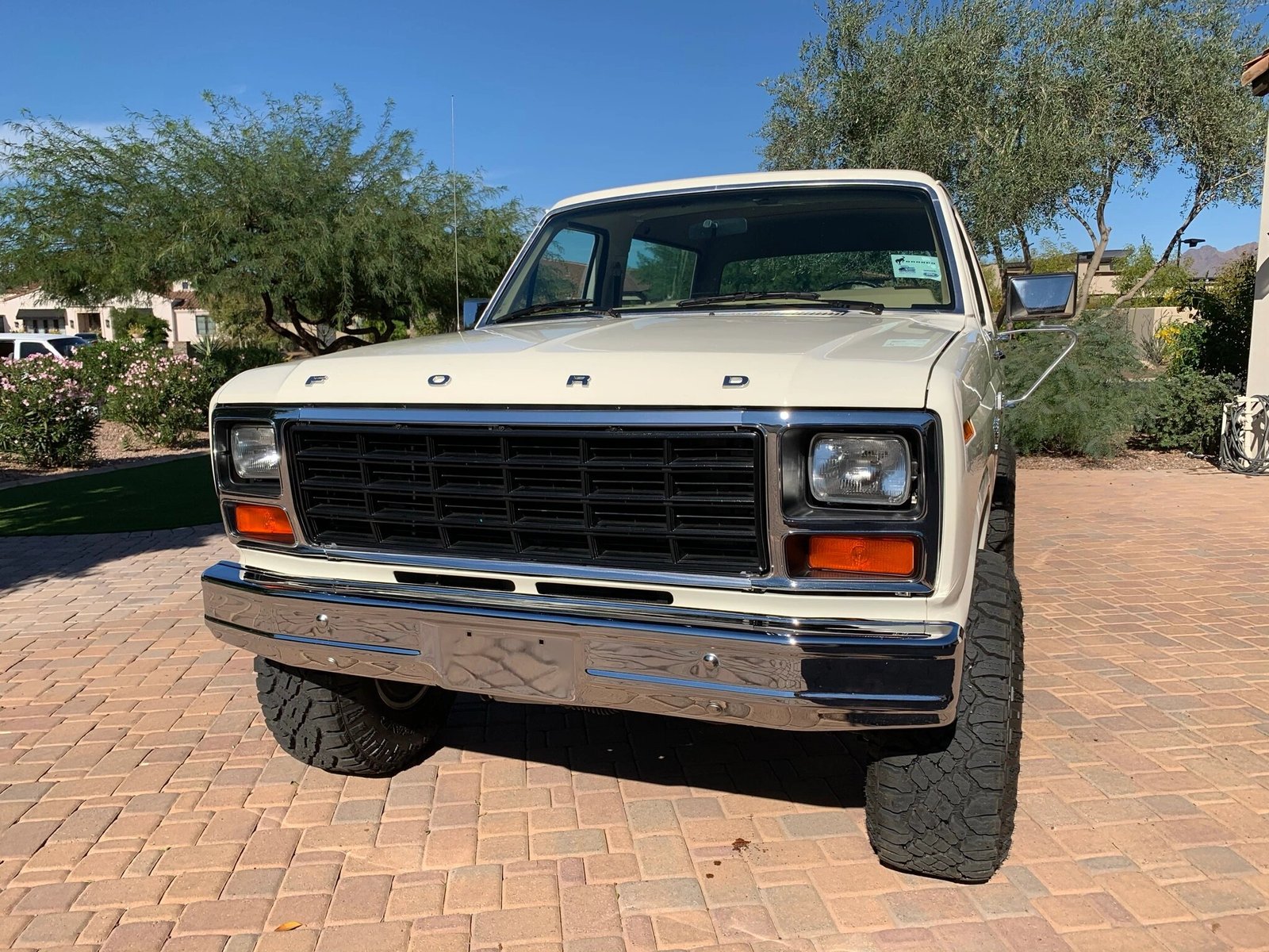 This 1980 Ford Bronco received a refurbishment that included refinishing the cream exterior, reupholstering the tan interior, replacement of glass, and overhauls of the engine, brakes, and suspension systems.