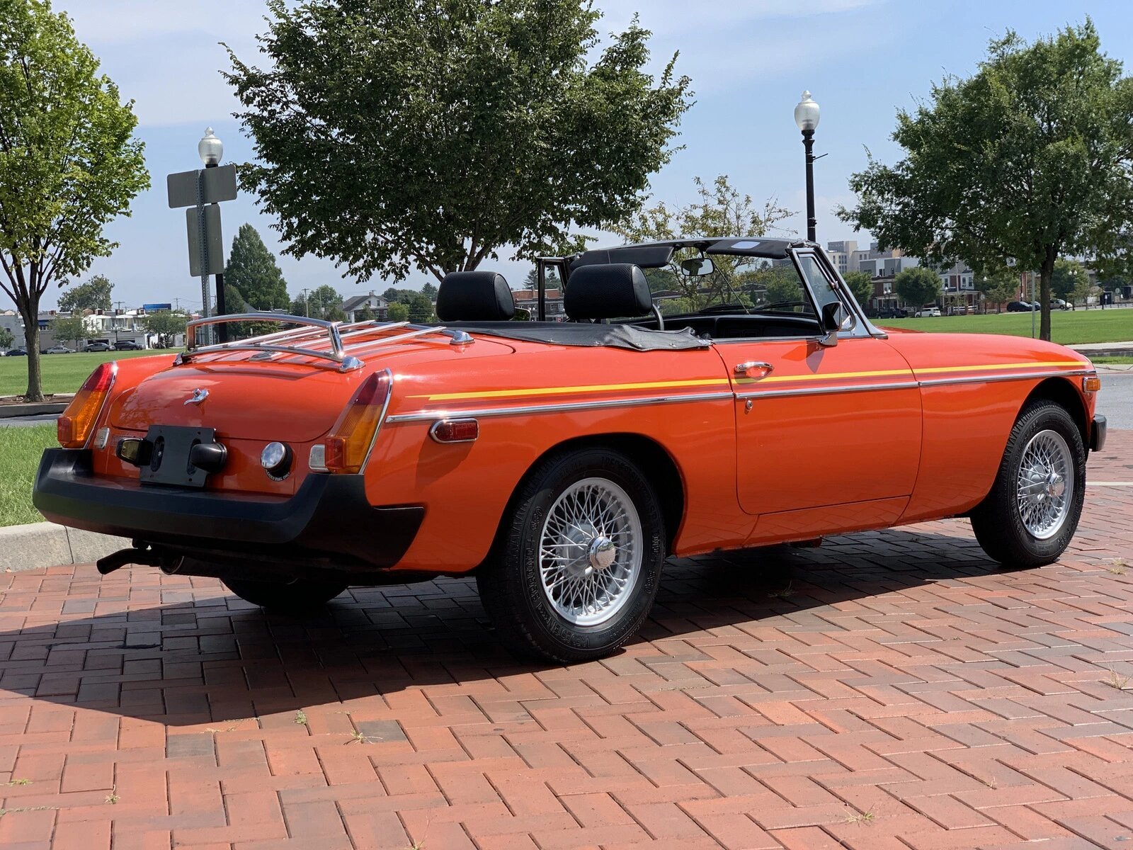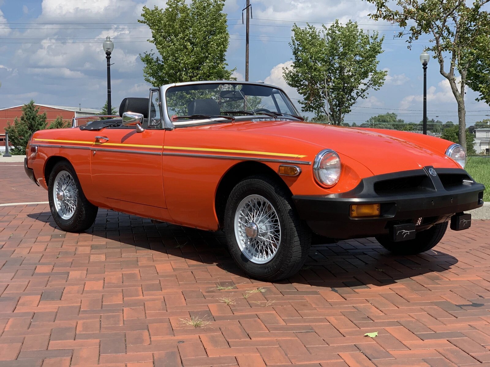 The body is finished in Vermillion Red with yellow stripes and a black convertible top.