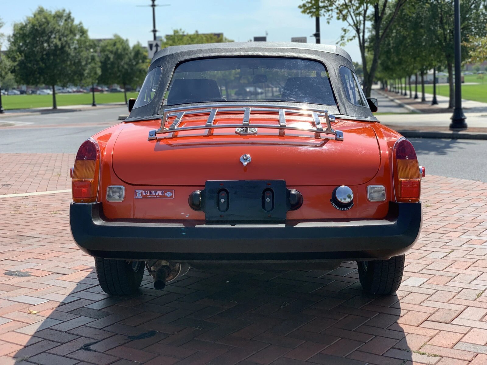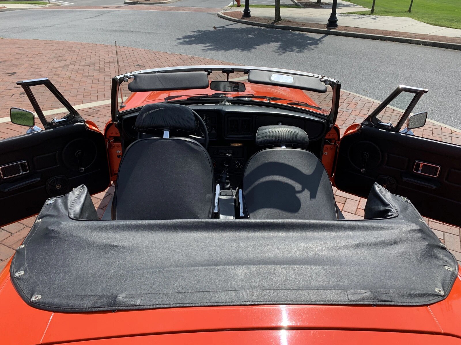 The cabin features high-back bucket seats trimmed in black vinyl with matching carpets and MG-branded floor mats.