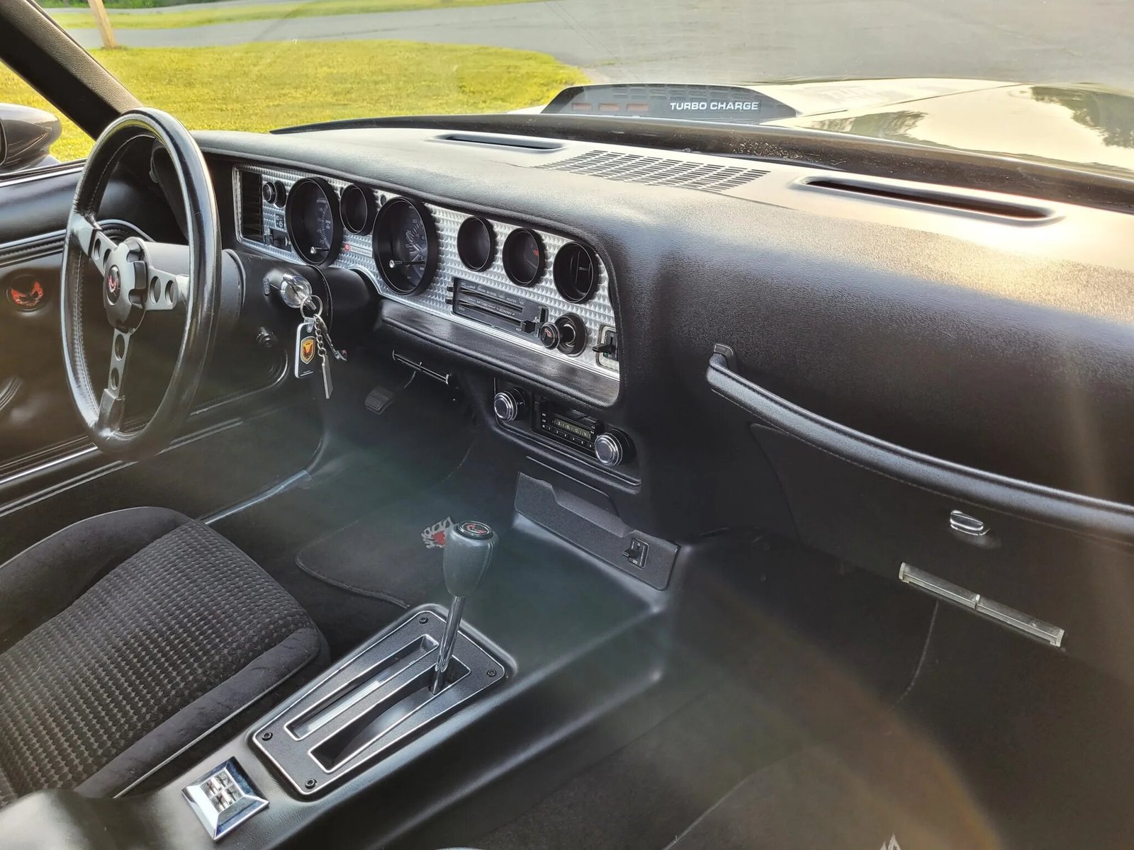 Exterior features include a Trans Am hood graphic, a reverse hood scoop, a front air dam, an integrated rear spoiler, quad headlights, and removable glass T-top roof panels.