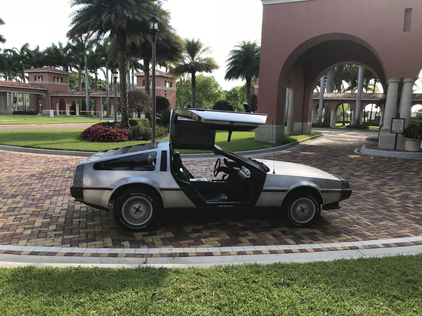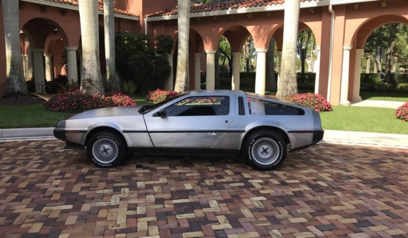 This 1981 DeLorean DMC-12 features brushed stainless-steel bodywork over black leather upholstery and is powered by a 2.85-liter V6 paired with a three-speed automatic transaxle. Equipment includes gullwing doors, a louvered rear window cover, staggered-diameter alloy wheels, air conditioning, and a cassette stereo.