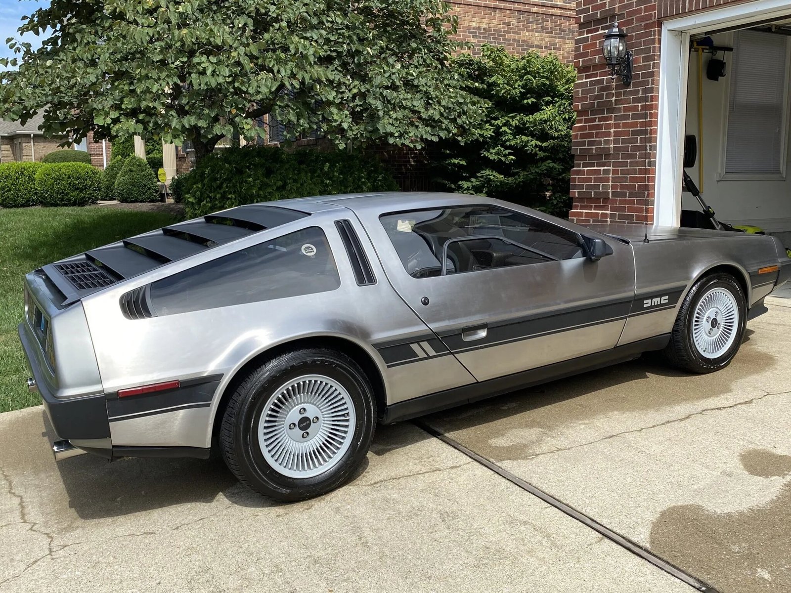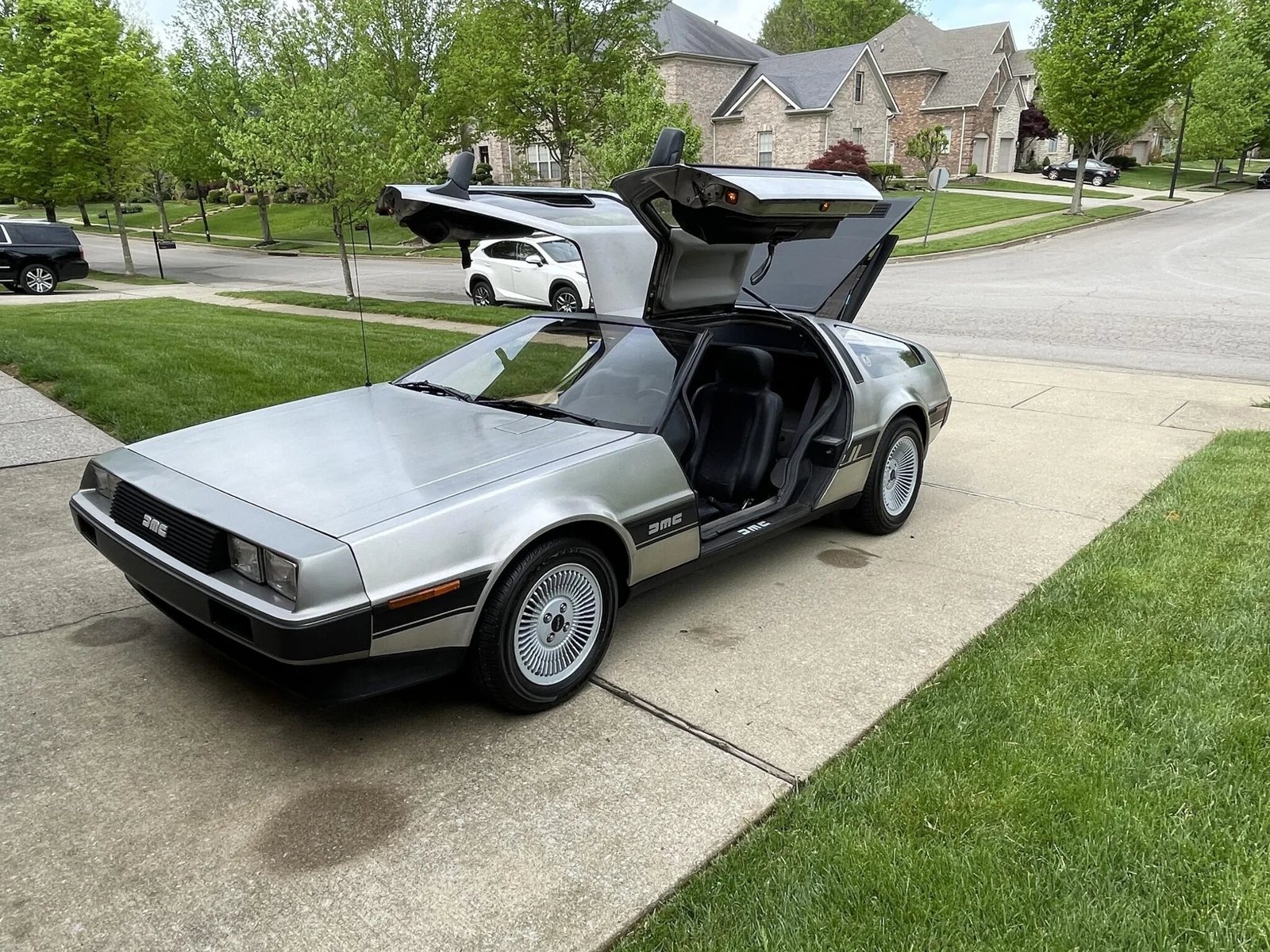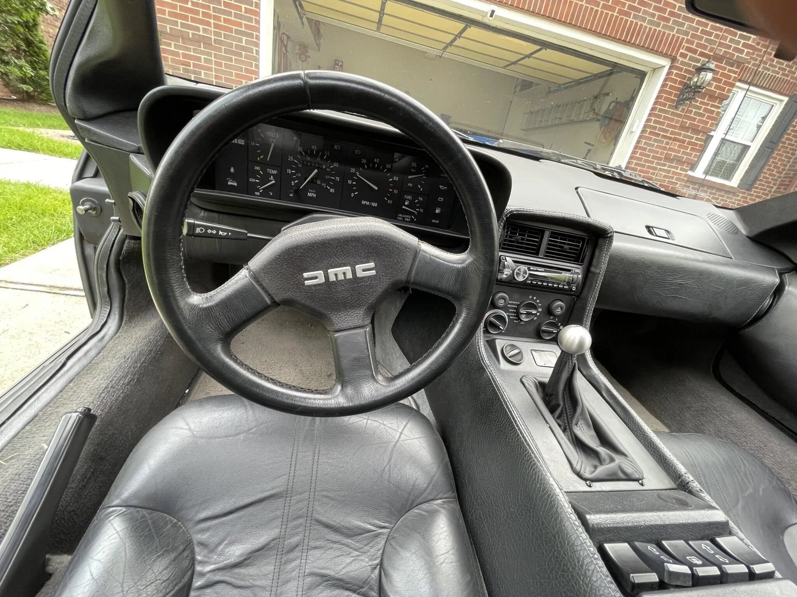 This 1981 DeLorean DMC-12 features brushed stainless steel bodywork over black leather upholstery and is powered by a twin-turbocharged 2.85-liter V6 paired with a five-speed manual transaxle.