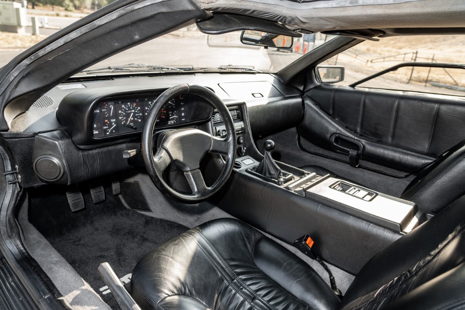 Power comes from a 2.85-liter V6 paired with a five-speed manual transaxle, and additional equipment includes gull-wing doors, a louvered rear-window cover, a grooved hood with gas flap, staggered-diameter cast-aluminum wheels finished in gray, power windows, central locking, and an aftermarket Pioneer stereo.