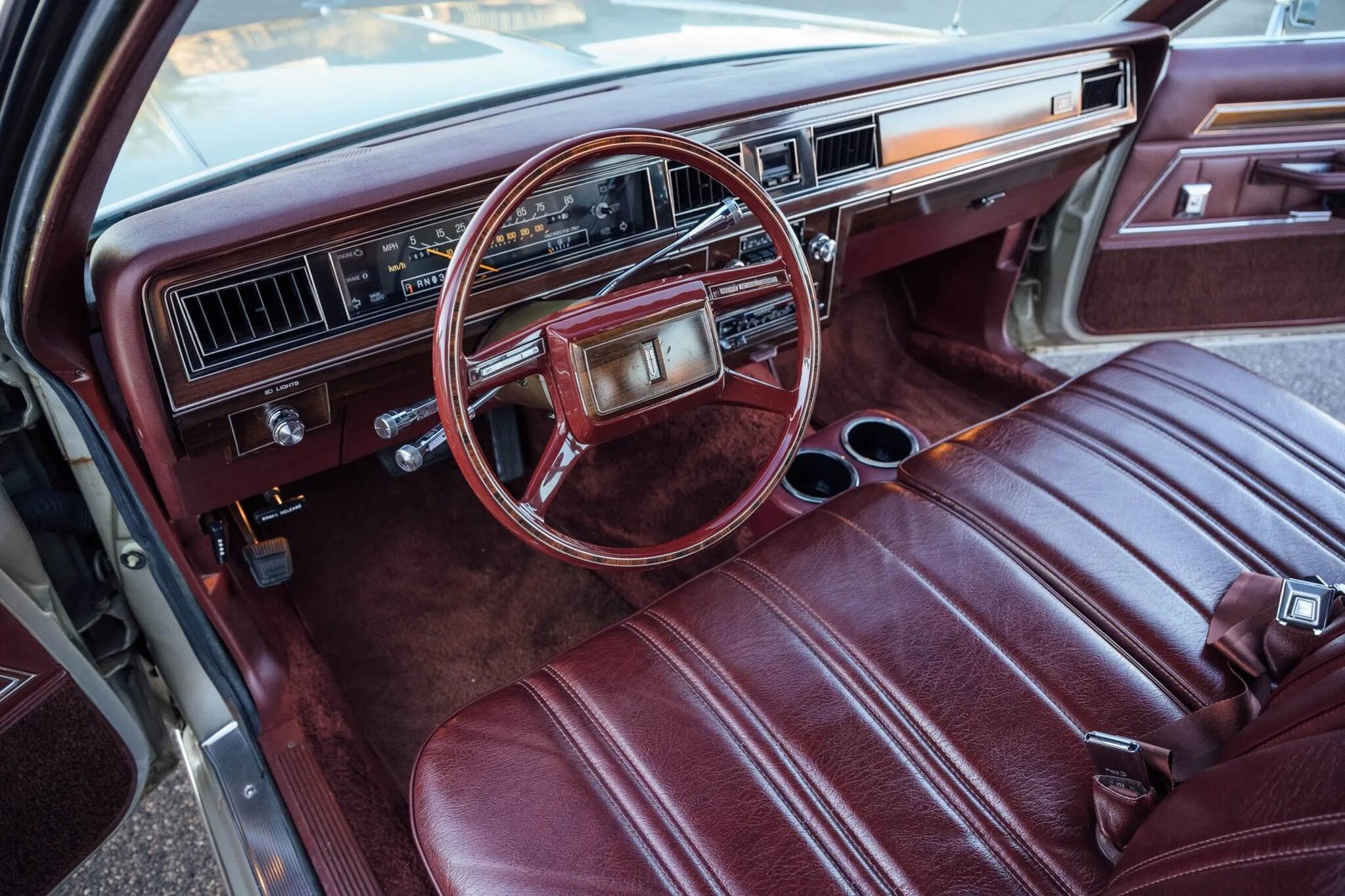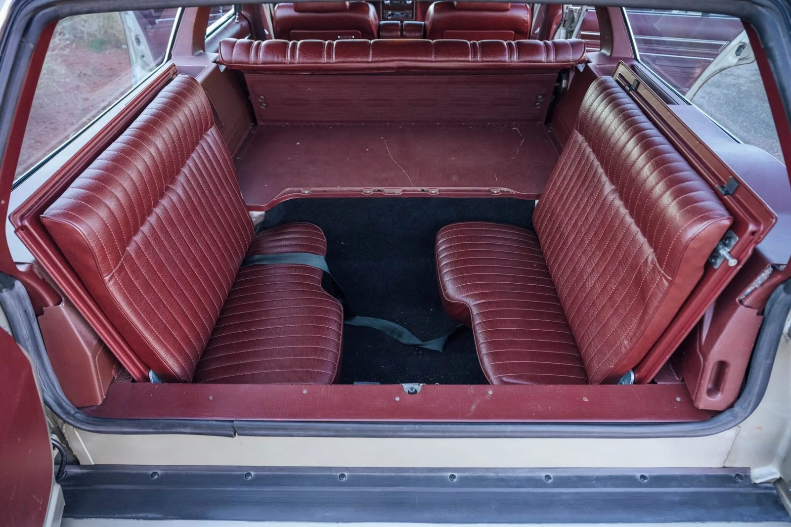 The cabin features front and rear bench seats upholstered in burgundy vinyl joined by matching dash trim, door panels, carpeting, and seatbelts.