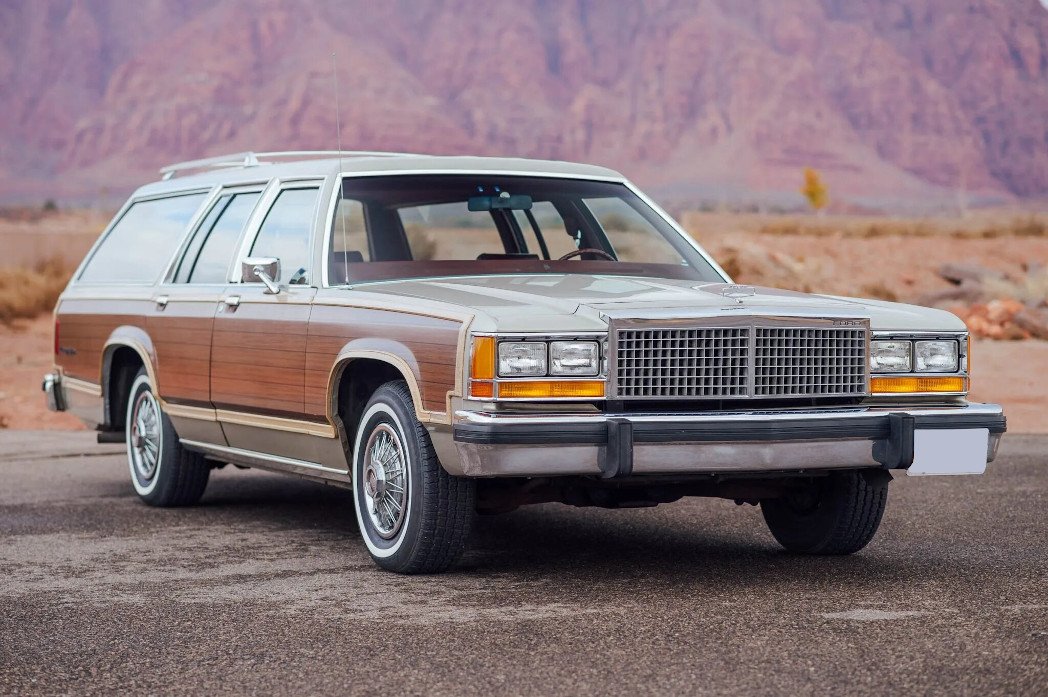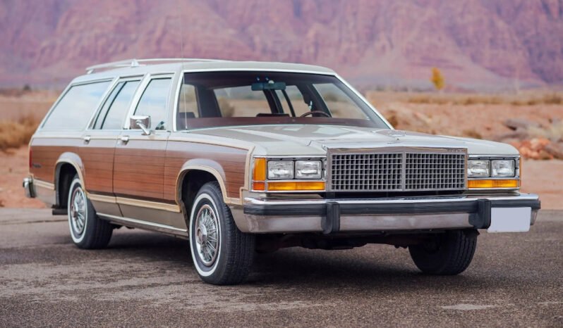 Features include simulated woodgrain exterior trim, a chrome roof rack, air conditioning, cruise control, power steering, a power-adjustable driver’s seat, a digital clock, power windows, power front disc brakes, and a push-button AM/FM radio.