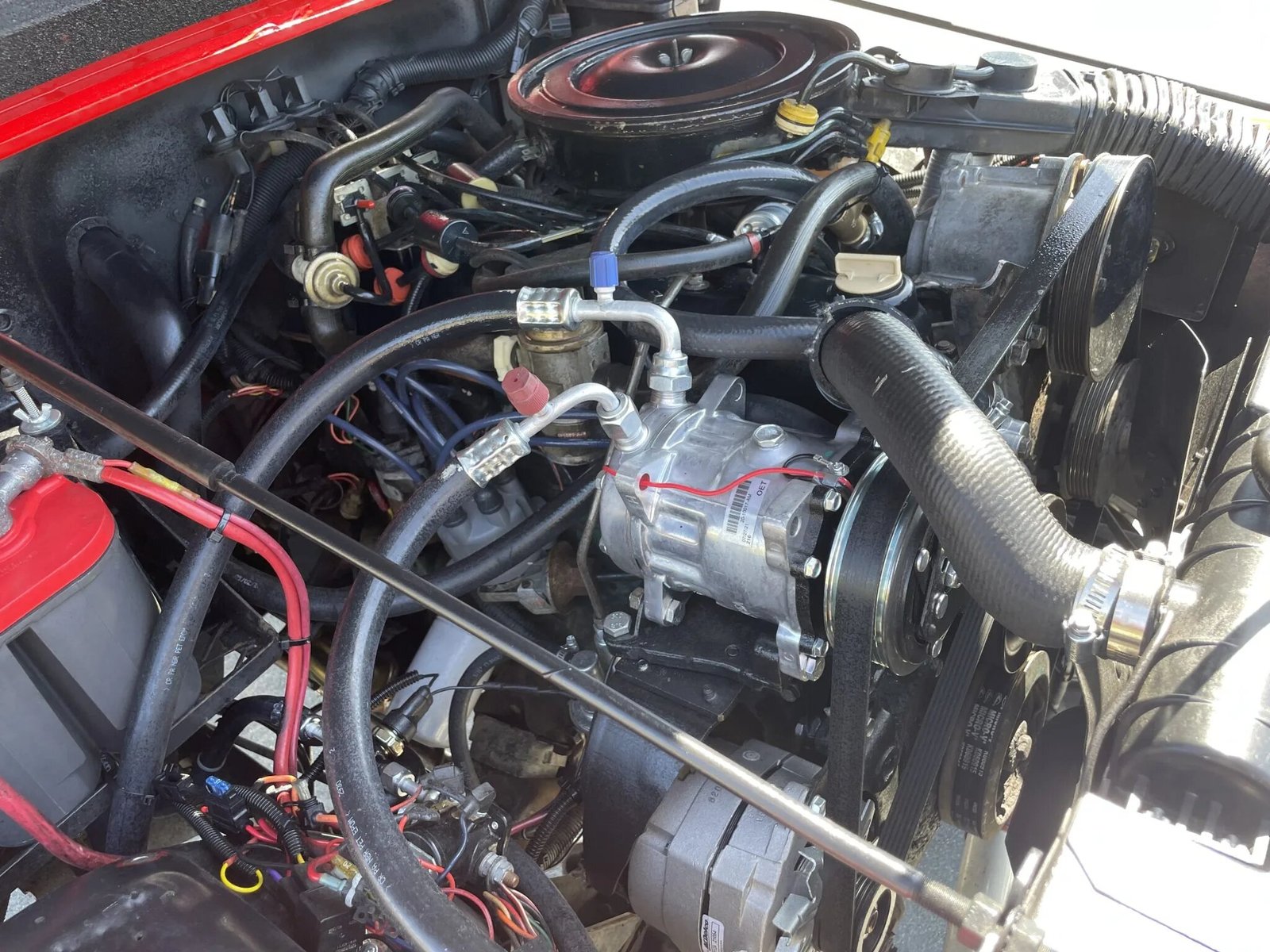 The truck was refinished in red, and is equipped with a removable black hardtop and full-frame doors.