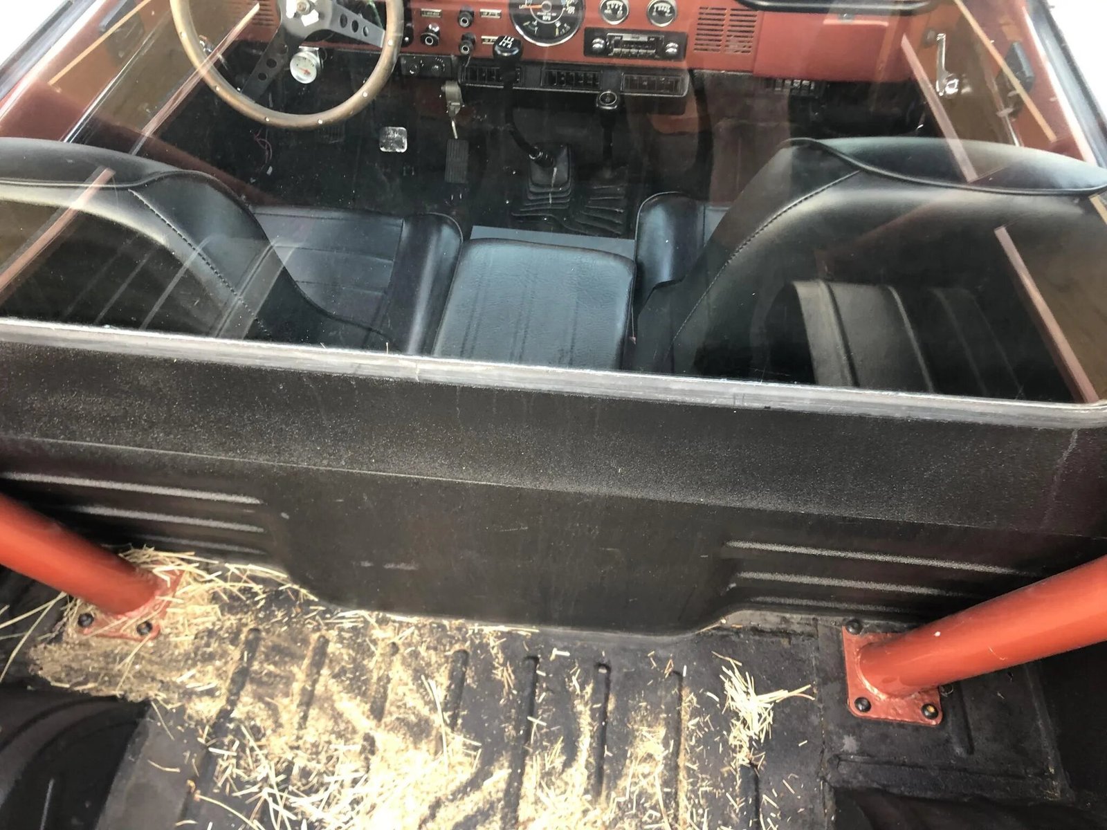 The floors have been coated with black bedliner material, and additional appointments include air conditioning, an aftermarket stereo, and a center console with lockable storage.