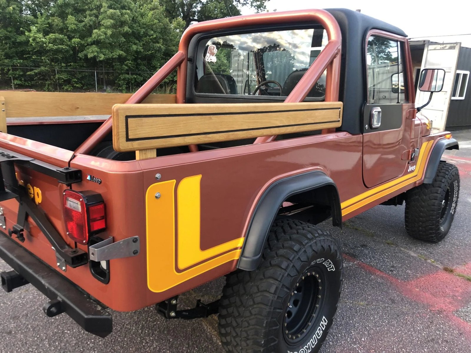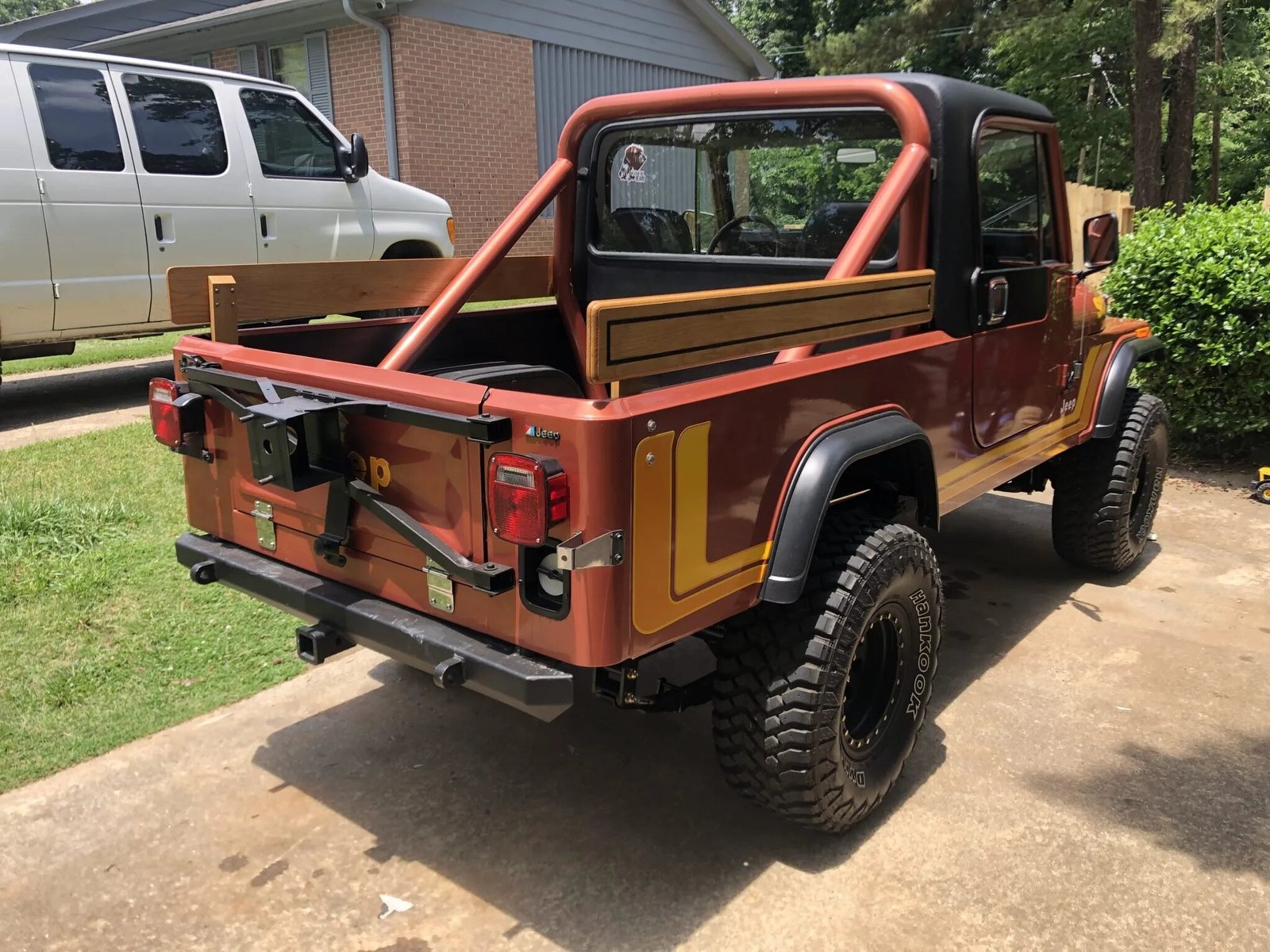 Additional equipment includes a removable hardtop, a roll bar, aftermarket bumpers, replacement wheel-arch flares, wood bed rails, and a rear receiver hitch.