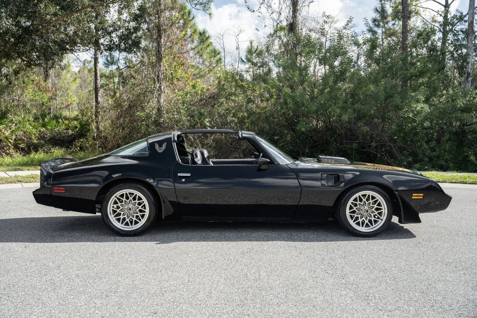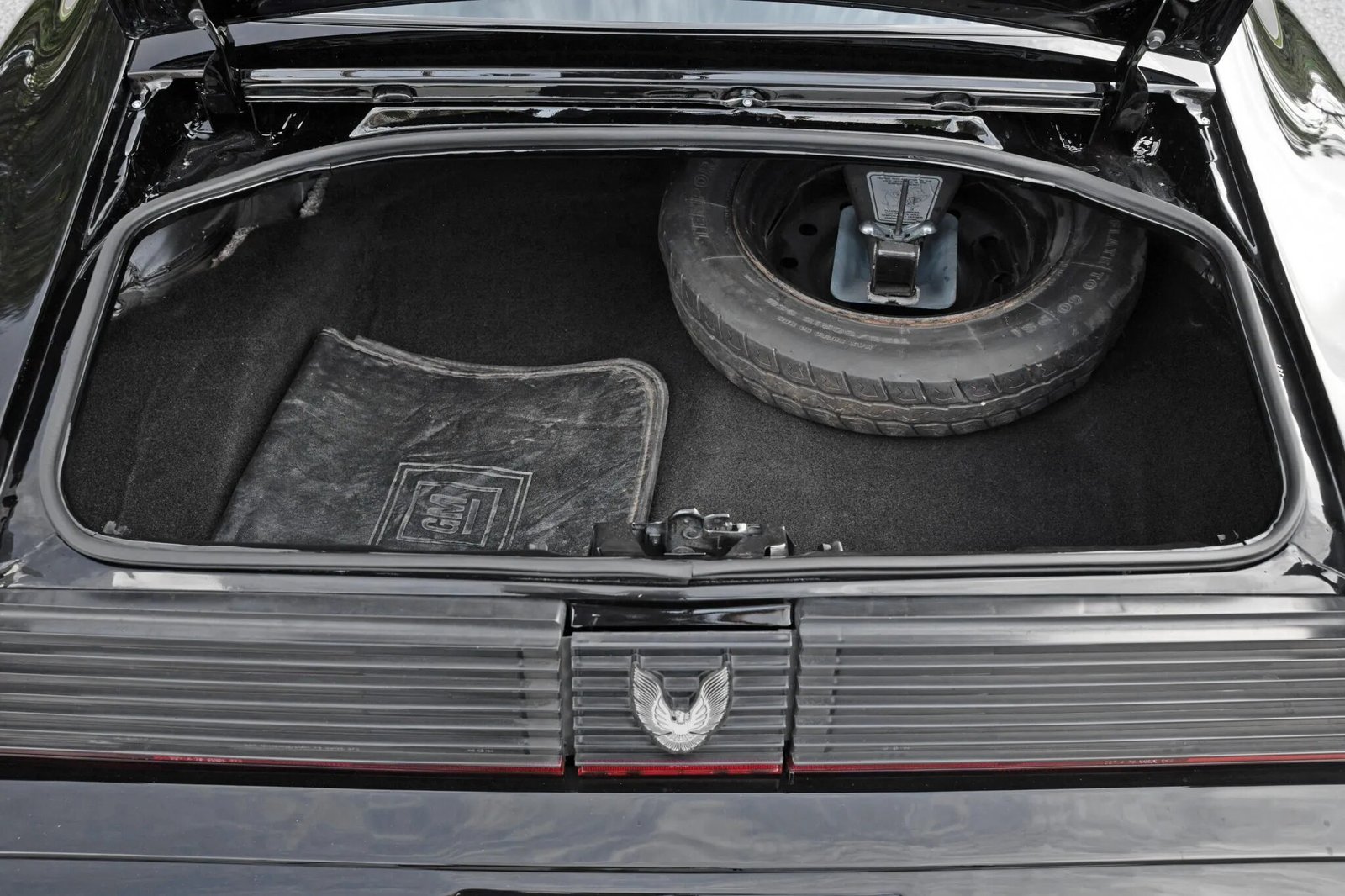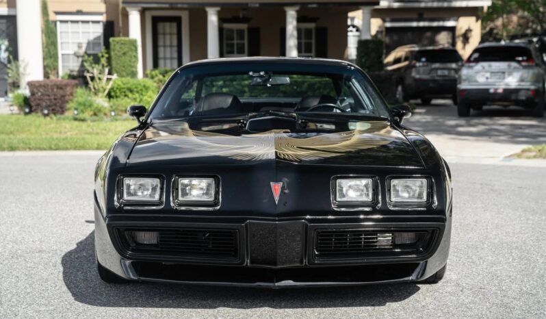 The car was refinished in black following bodywork repairs and has a Firebird hood graphic. Additional details include a custom-fabricated shaker scoop mount, a front spoiler, removable t-top roof panels, a rear spoiler, and painted mirror caps.