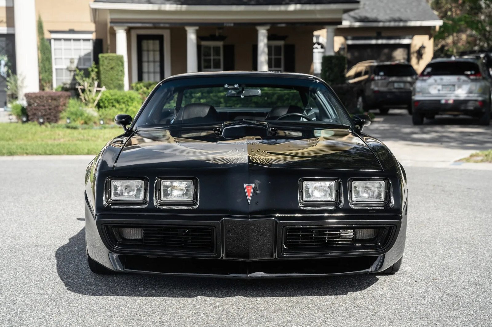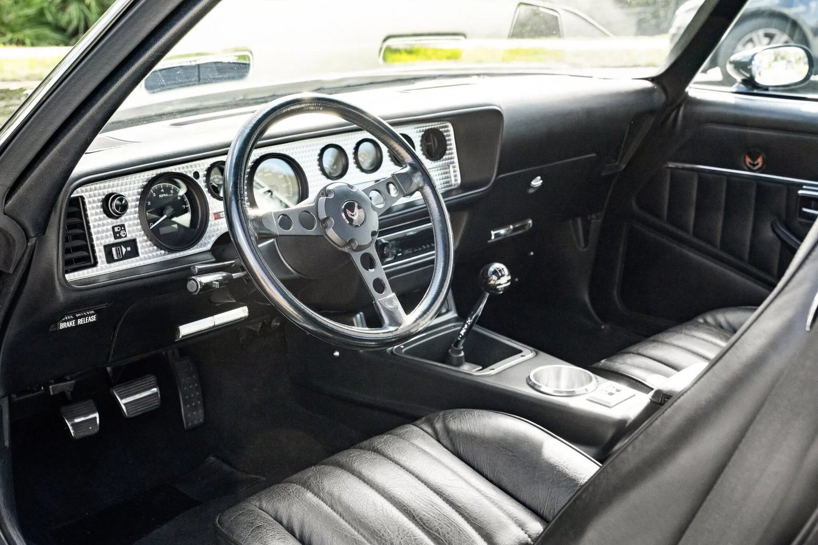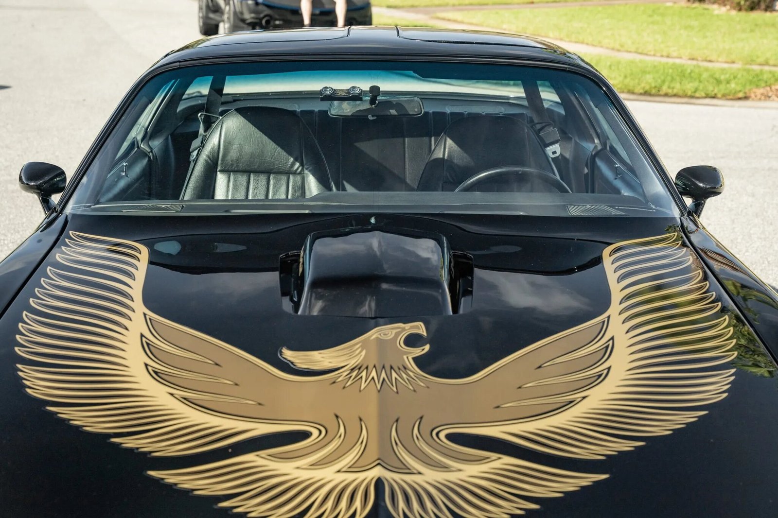 The car was refinished in black following bodywork repairs and has a Firebird hood graphic. Additional details include a custom-fabricated shaker scoop mount, a front spoiler, removable t-top roof panels, a rear spoiler, and painted mirror caps.