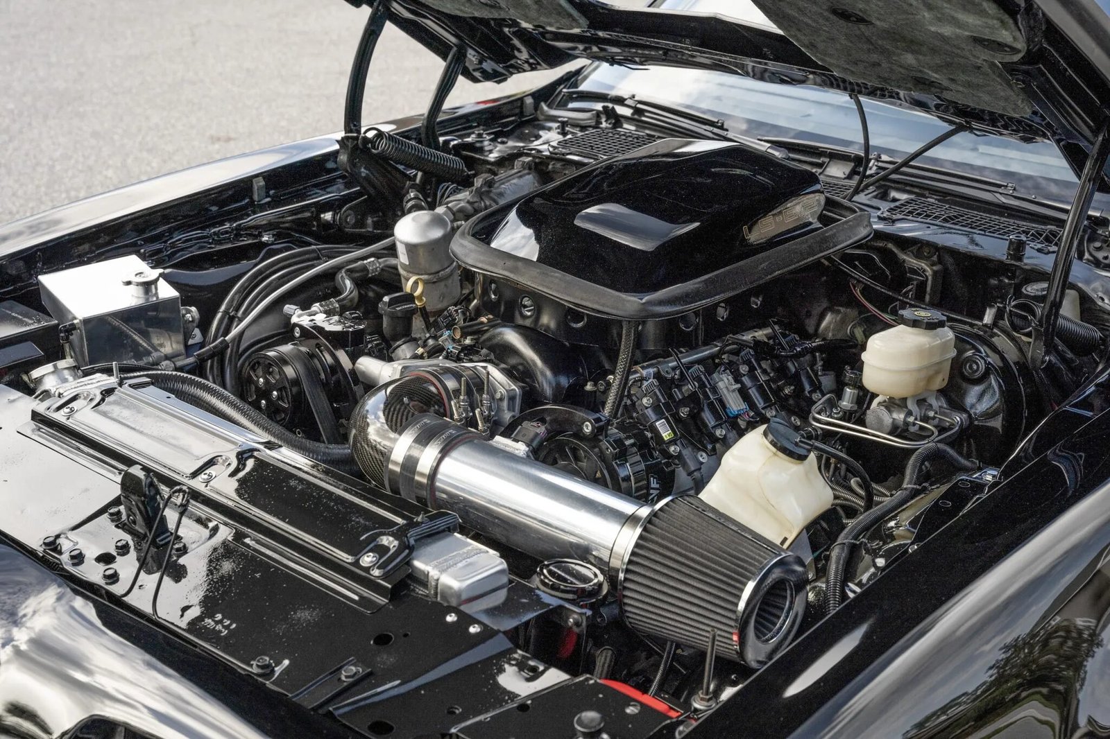 The 6.2-liter LS3 V8 was installed in 2021 and is equipped with a carbon-fiber cold air intake mount, stainless steel exhaust headers, a CVF Racing eight-rib serpentine accessory drive, and a Griffin radiator with dual electric fans.