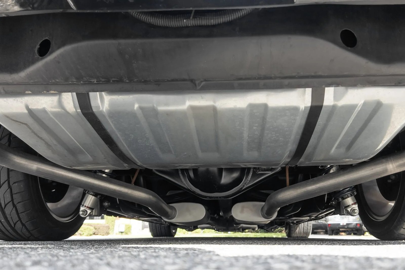 Power is routed to the rear wheels through a Tremec T56 Magnum six-speed manual transmission, an aluminum driveshaft, and a Currie 9″ limited-slip differential with 3.91:1 gears. The underside was refinished during the refurbishment and a MagnaFlow exhaust and a replacement fuel tank with an in-tank pump were fitted.