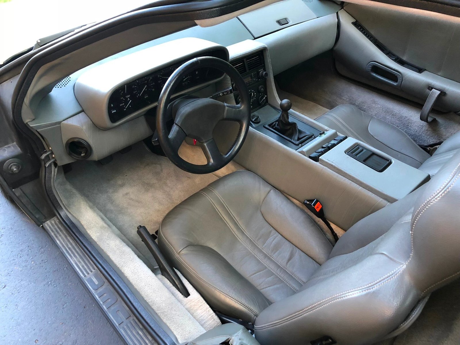 The cabin is trimmed in grey leather, the doors open and close properly, the odometer shows 12,185 miles.
