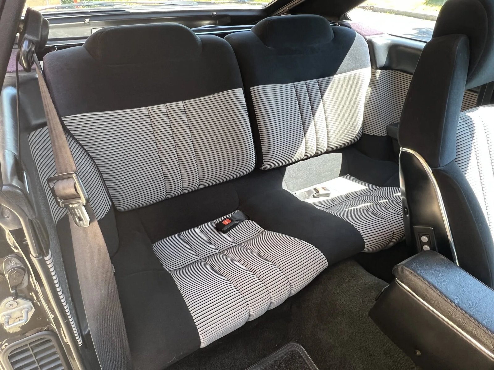 The cabin features front sport seats and a rear bench upholstered in black cloth with striped inserts along with color-coordinated door panels and carpets.