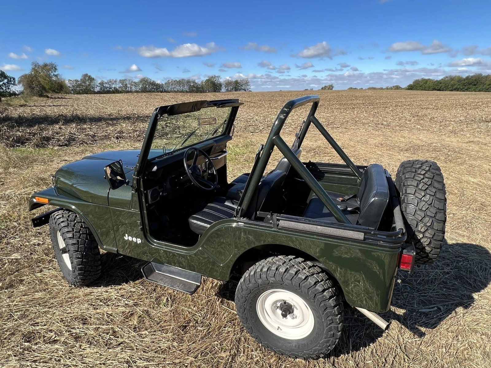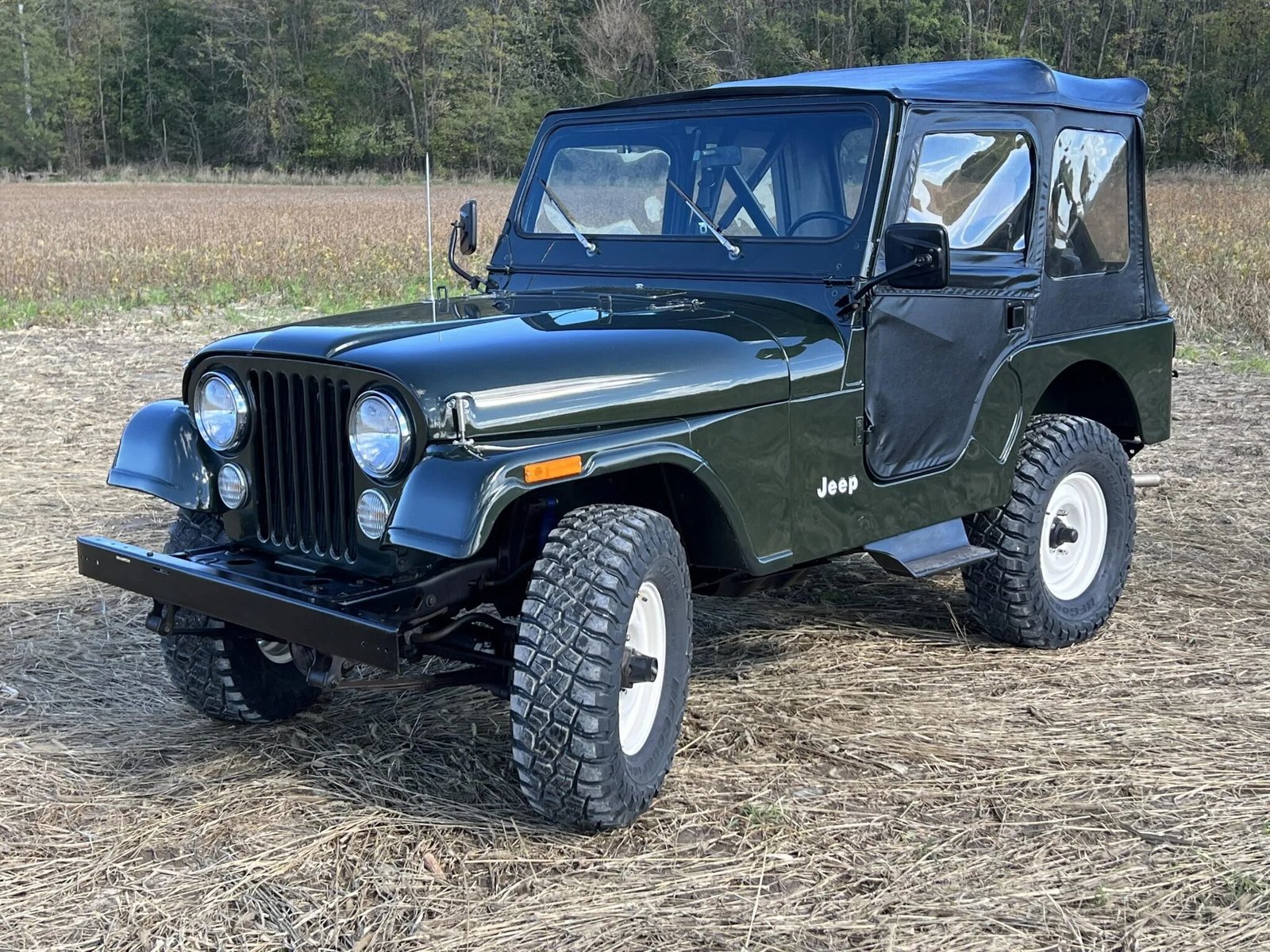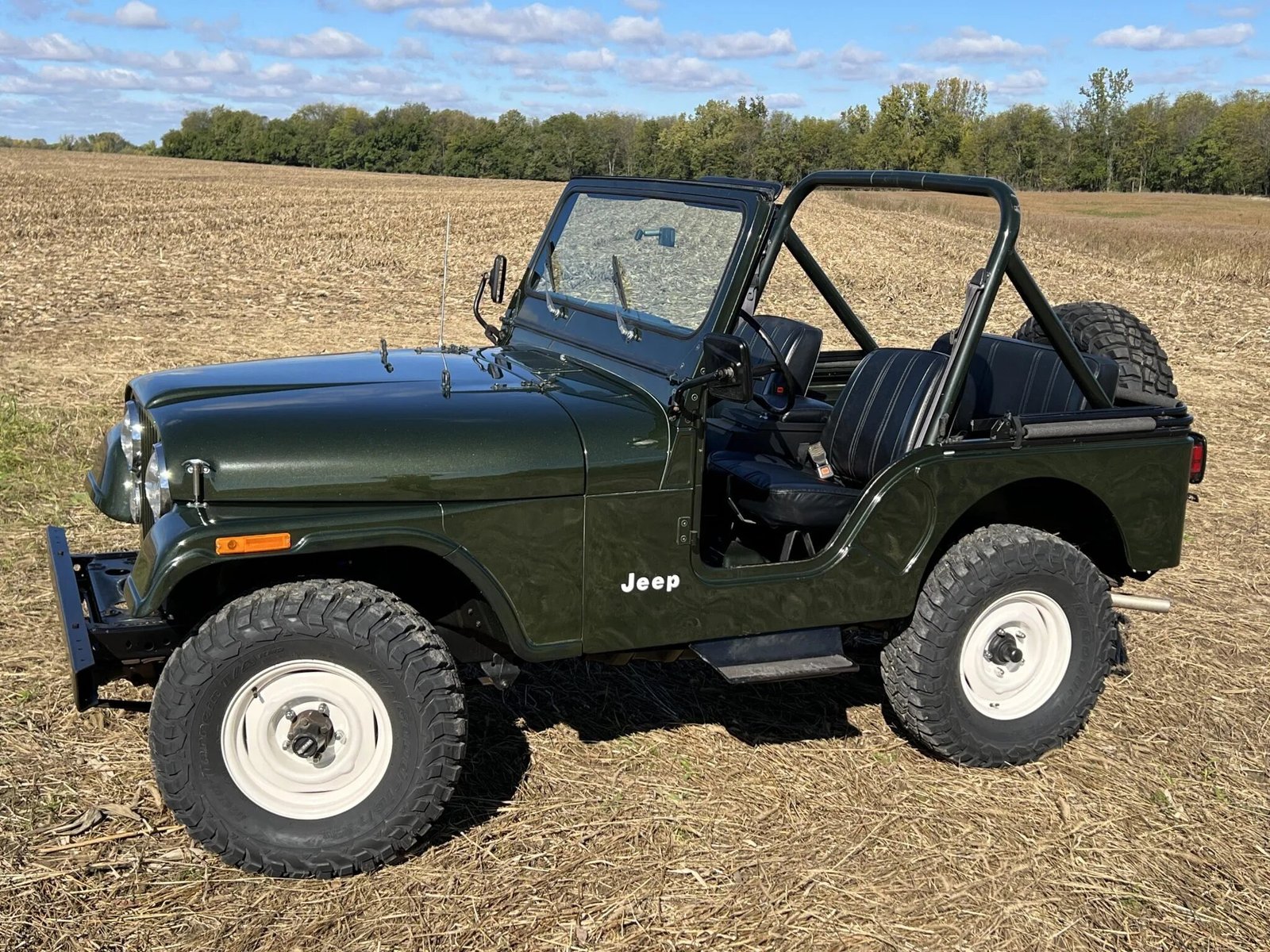 This 1983 Jeep CJ-5 is finished in Sherwood Green Metallic over black vinyl and is powered by a 4.2-liter inline-six paired with a four-speed manual transmission and a dual-range transfer case.