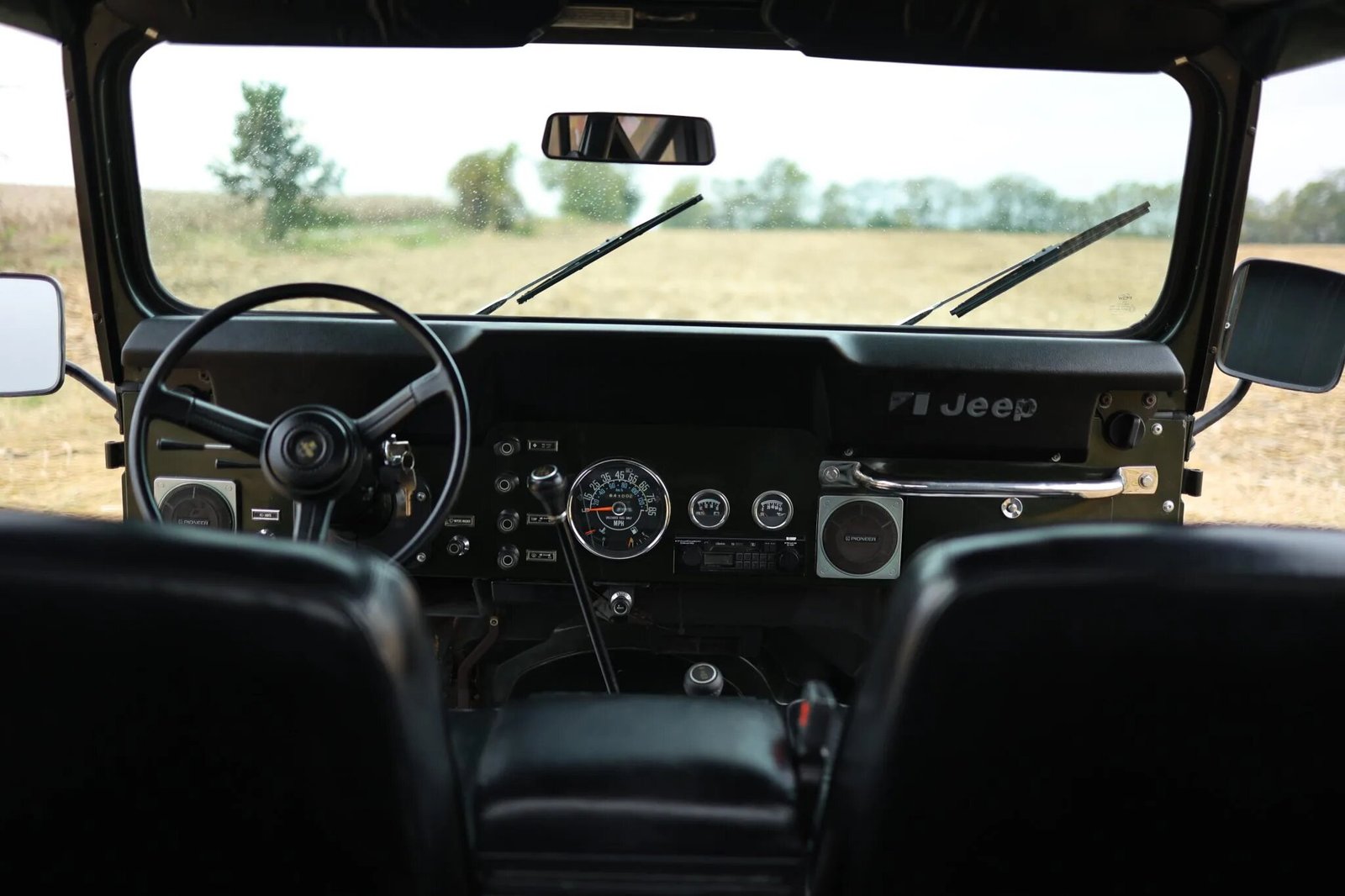 Equipment includes a Tuffy lockable center console, a cassette stereo linked to Pioneer speakers, a chrome-finished passenger-side grab handle, a roll bar, and a floor-mounted shifter.