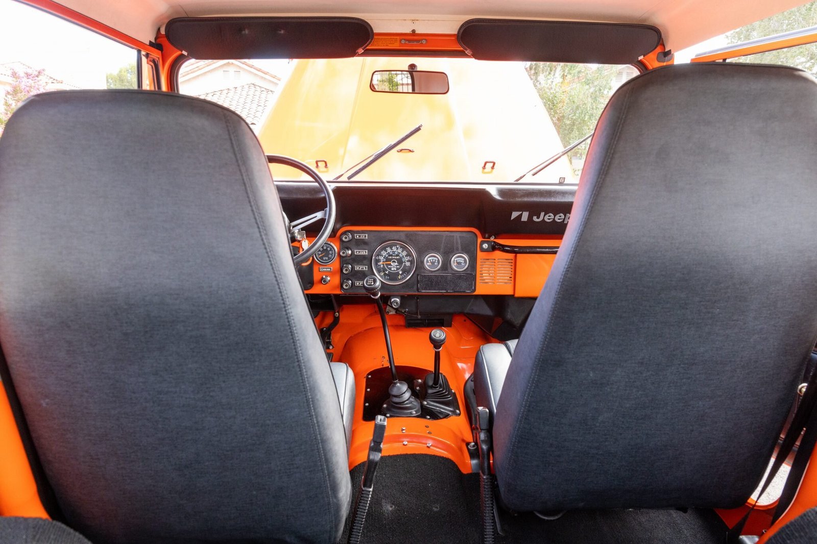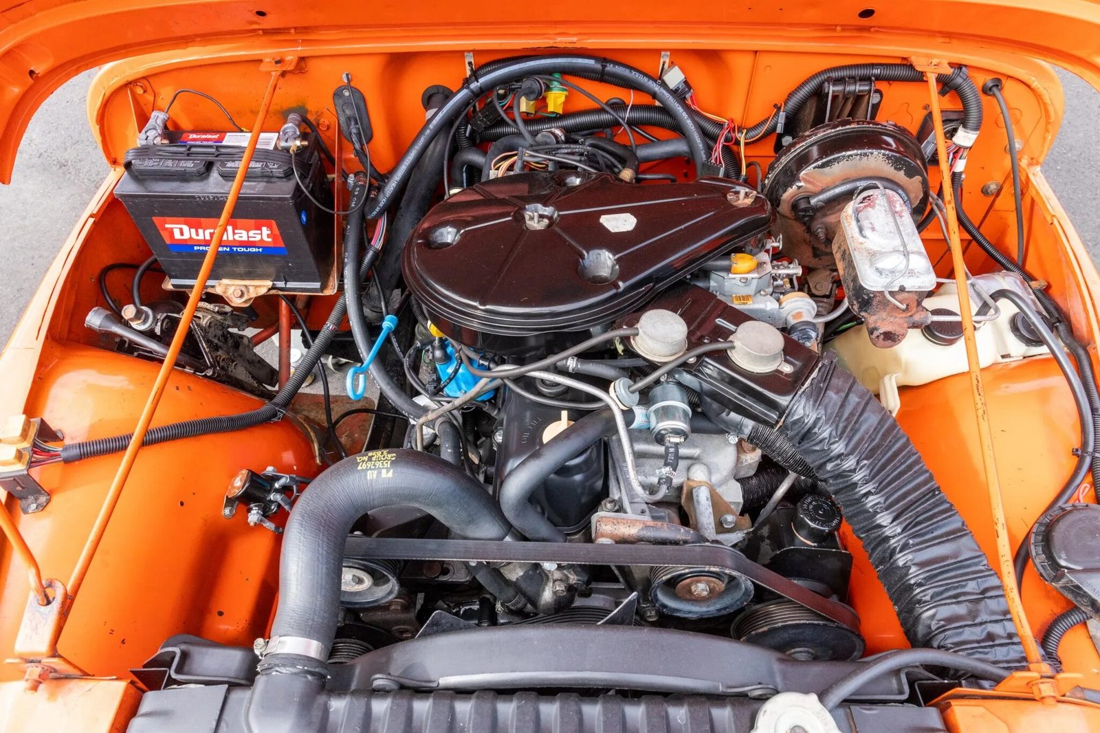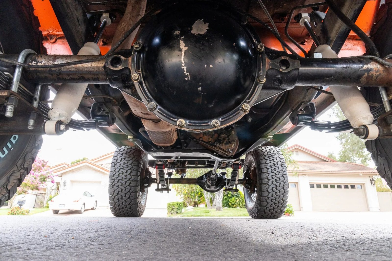 The truck is finished in orange over black vinyl and is powered by a 4.2-liter inline-six paired with a five-speed manual transmission and a dual-range transfer case.