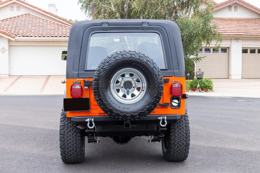 The truck is finished in orange and features a black removable hardtop, locking front hubs, full metal doors, black wheel-arch flares, aftermarket bumpers with tow hooks, and a receiver hitch.