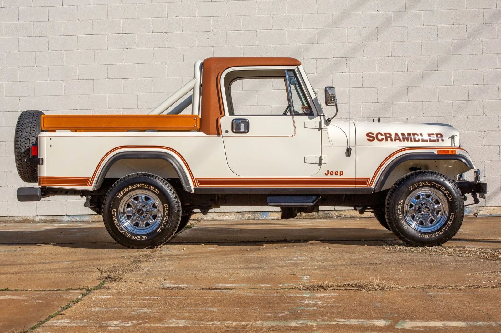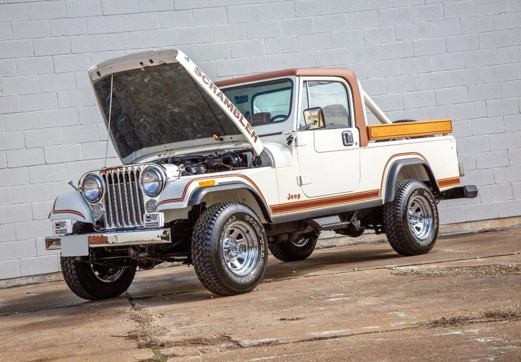 This 1983 Jeep CJ-8 Scrambler is finished in white over a brown interior and is powered by a 4.2-liter inline-six paired with a five-speed manual transmission and a dual-range transfer case.