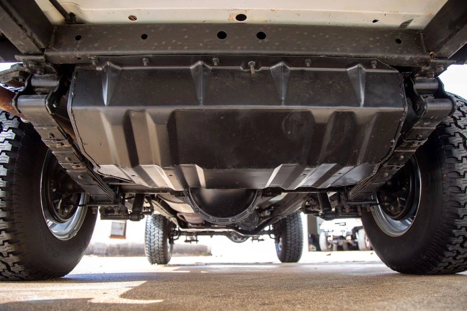 Polished 15″ wheels are wrapped in 235/75 Goodyear Wrangler Radial tires, and the front axle features locking hubs.