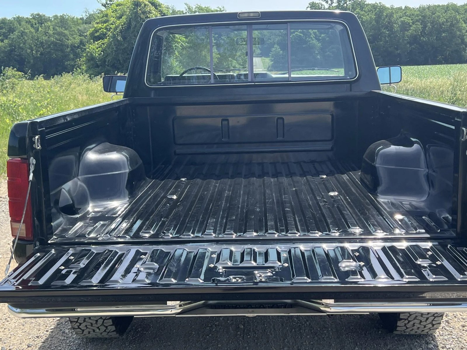 The truck is finished in black (1C) with red pinstripes and features chrome-accented bumpers, western-style side mirrors, and a sliding rear window.