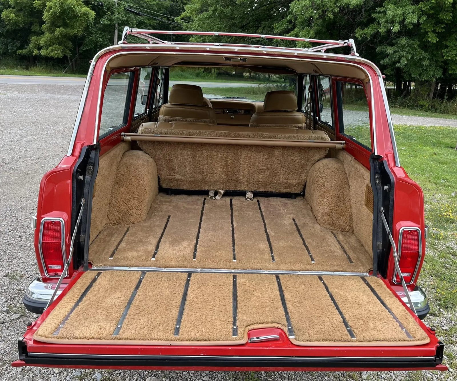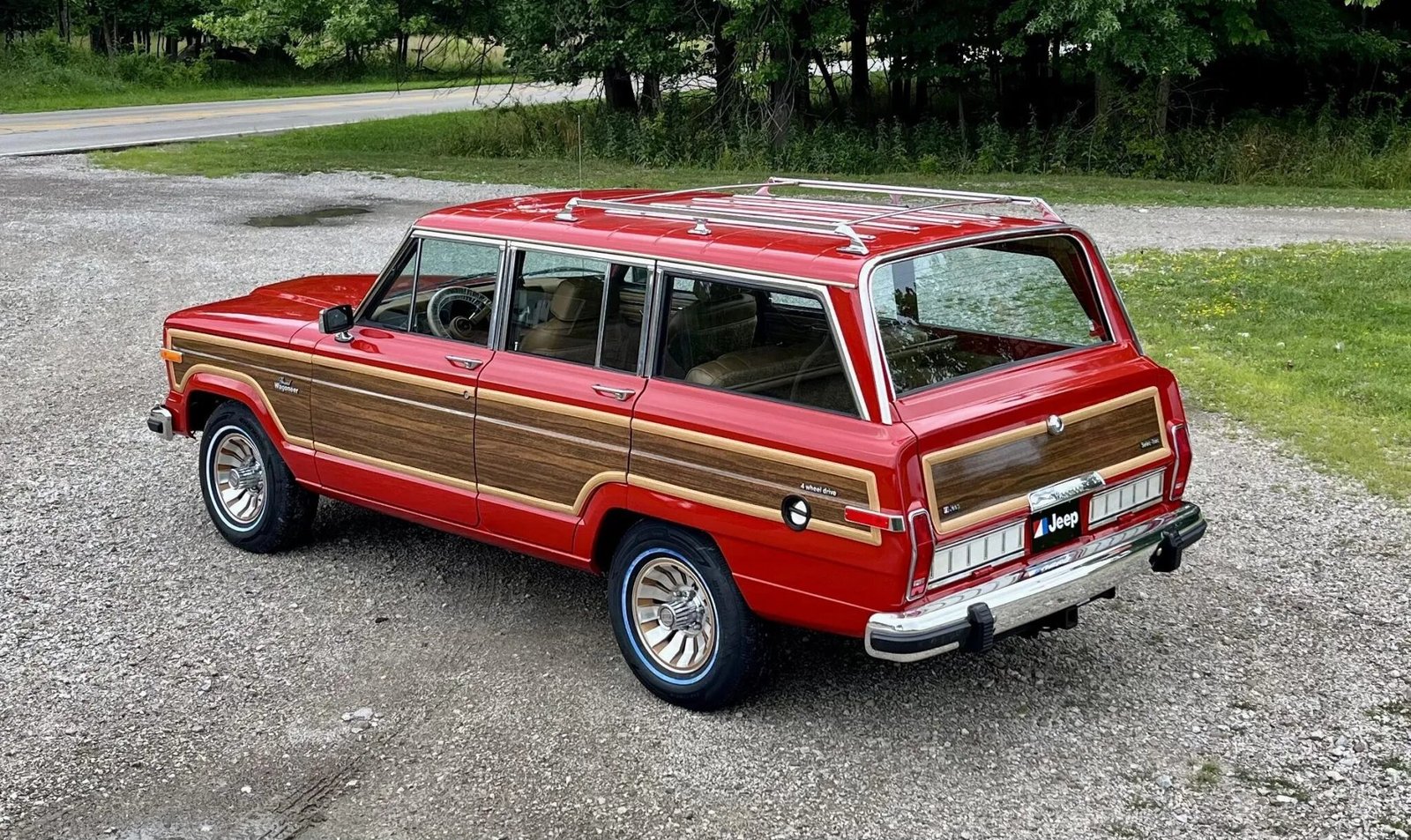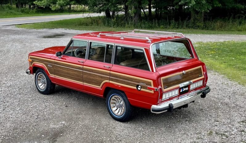Refurbishment work performed this 1985 Jeep Grand Wagoneer included refinishing the truck in red, replacing the faux woodgrain vinyl along with the exterior trim and seals, refurbishing the window mechanisms, installing Bilstein shocks, and overhauling the braking system. The truck is powered by a 360ci V8 linked with a three-speed automatic transmission and a dual-range transfer case, and additional equipment includes 15″ multi-spoke alloy wheels, a roof rack, a power-retractable rear window, air conditioning, and power-adjustable front seats trimmed in Honey leather and cloth.