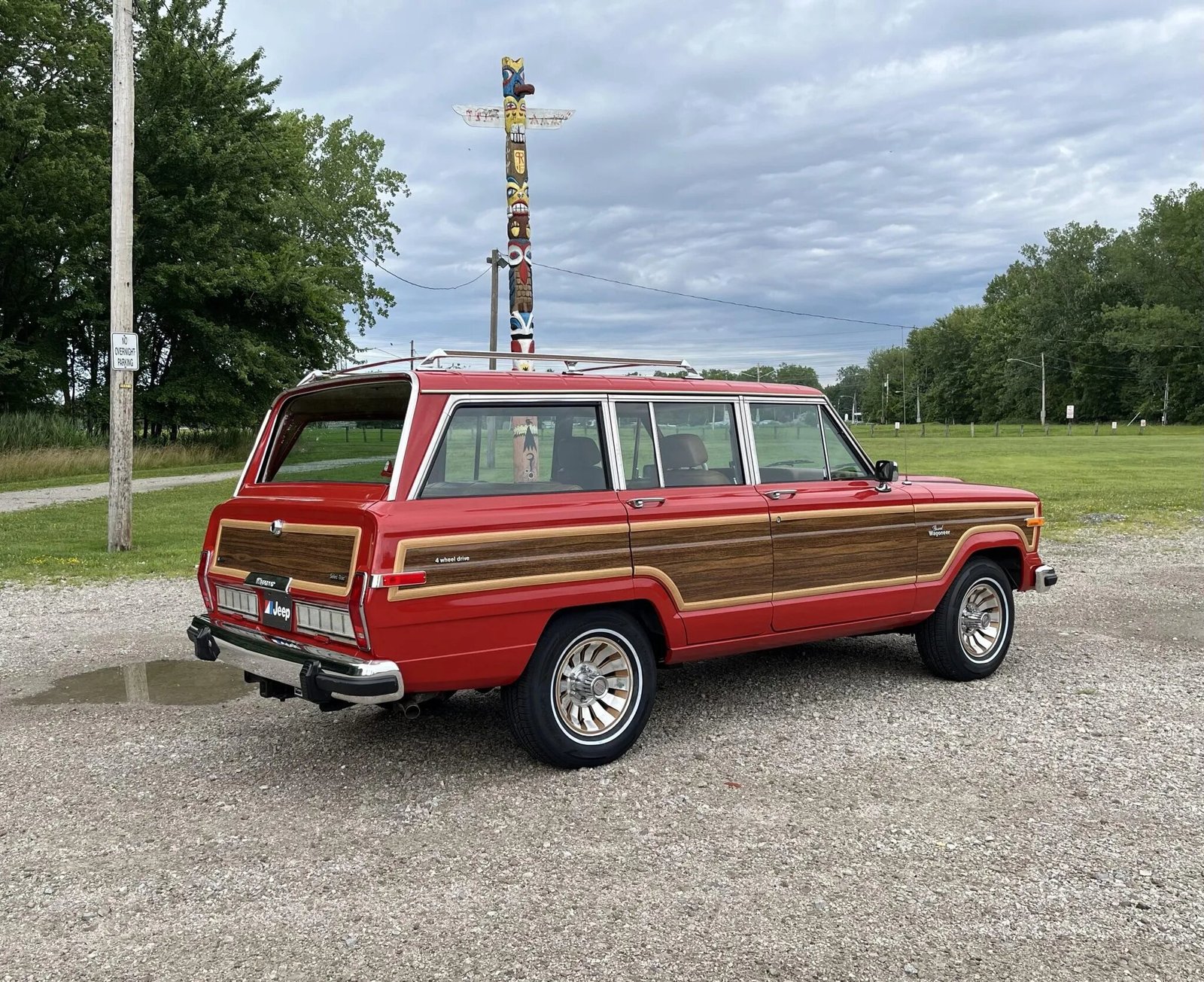 The truck was factory-finished in Sebring Red (3B) and was repainted in 2022. Additional work included installing cherry oak faux-woodgrain vinyl and trim along with overhauling the side and tailgate window mechanisms, removing and refurbishing the bumpers, and replacing the exterior weather seals, grille, bumper nerfs, and gas cap. Additional details include fog lights, an electric rear window, and a bright-finished roof rack, mirror caps, and window trim.