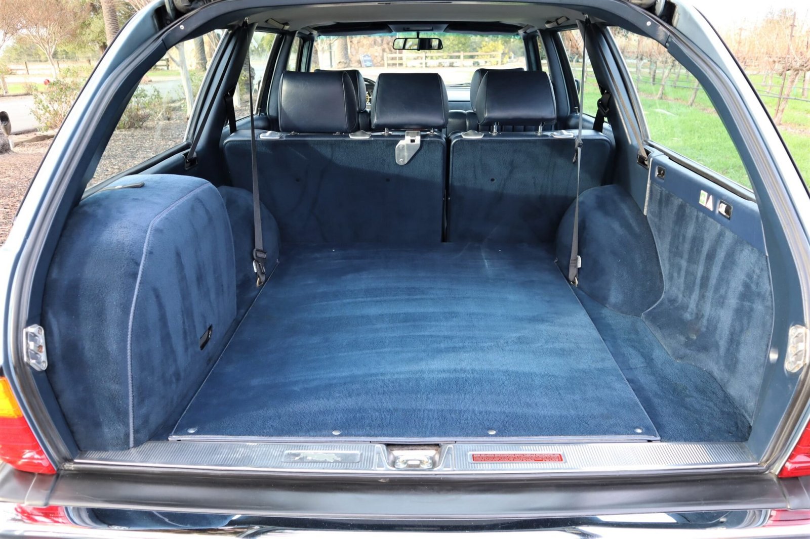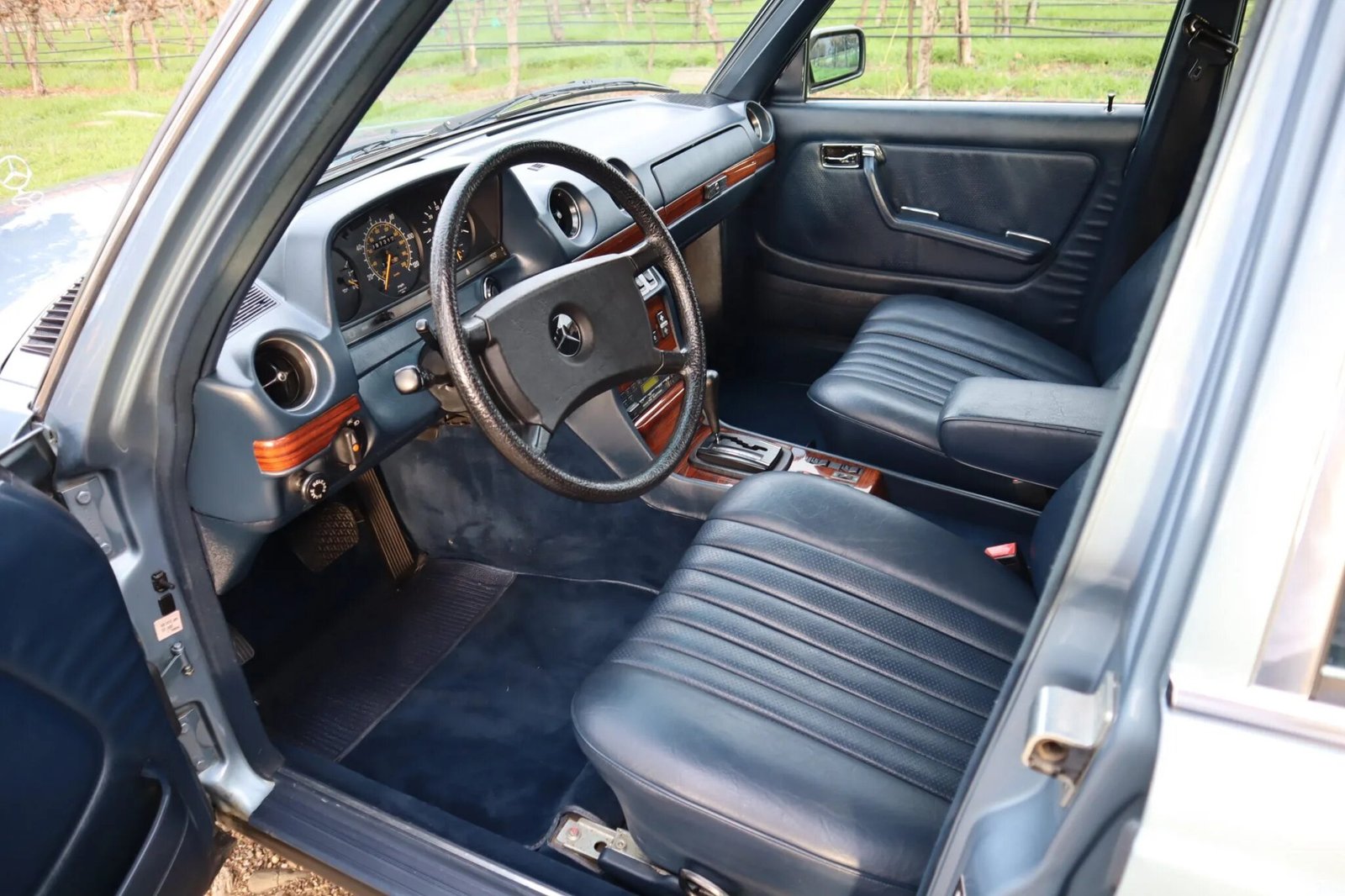 The cabin is upholstered in blue MB Tex with a matching dash, door panels, and carpeting and features Zebrano wood veneer trim on the dashboard.
