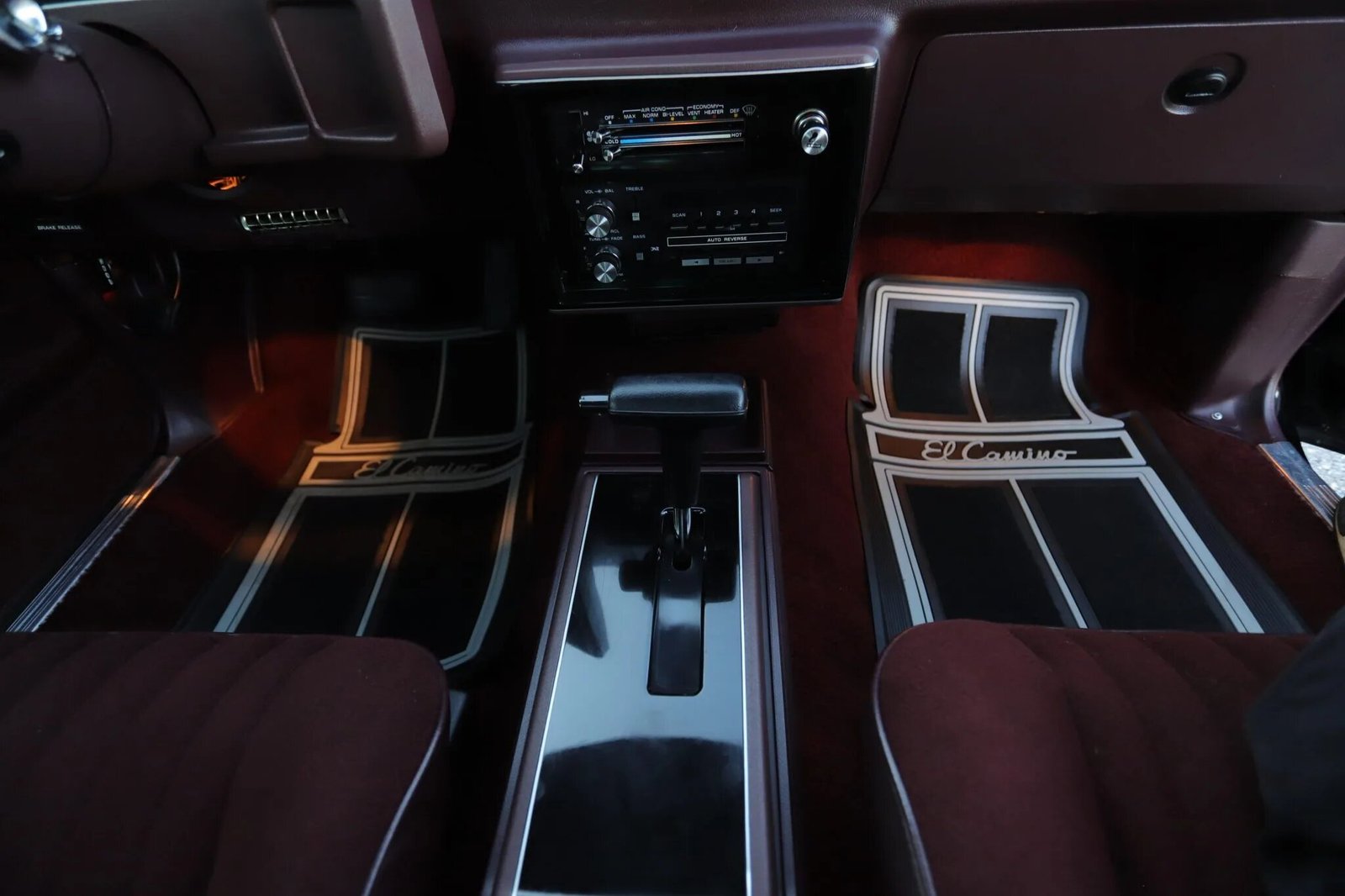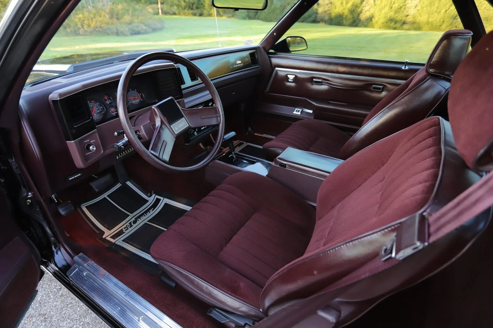 The interior features bolstered bucket seats trimmed in maroon cloth and vinyl with matching carpets and plastics.