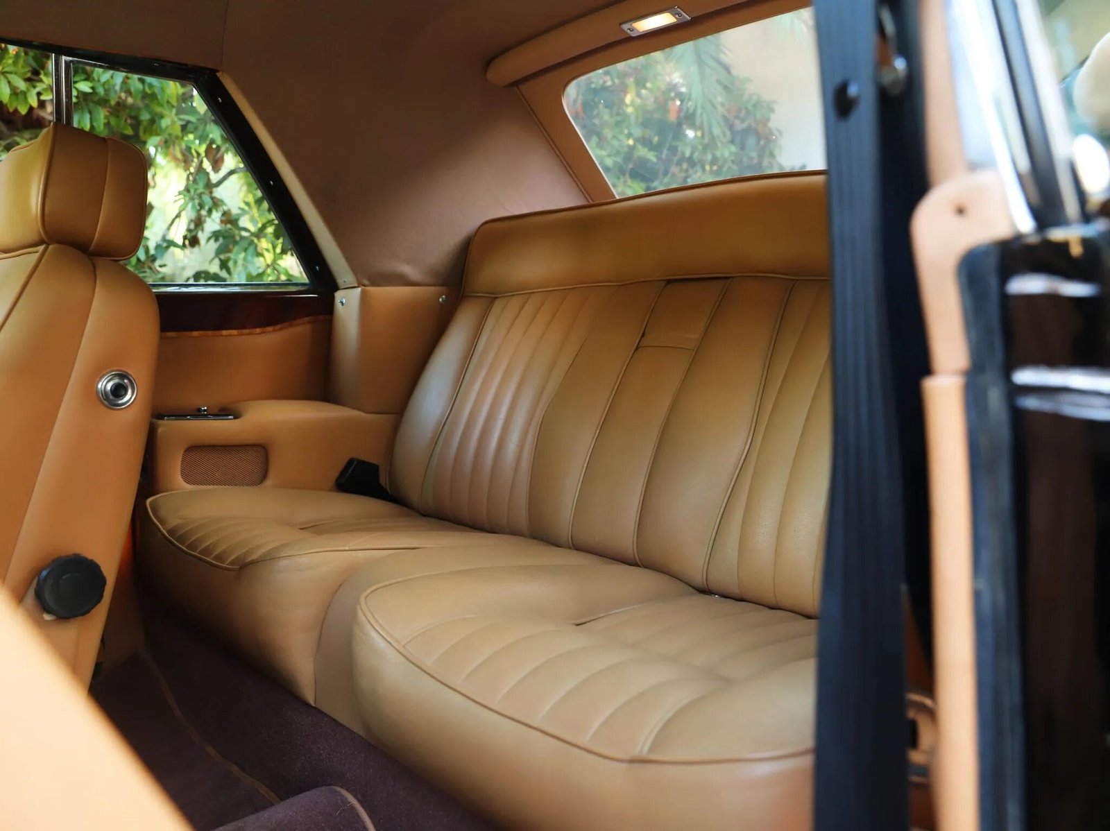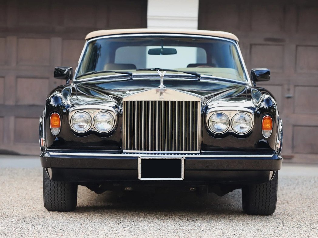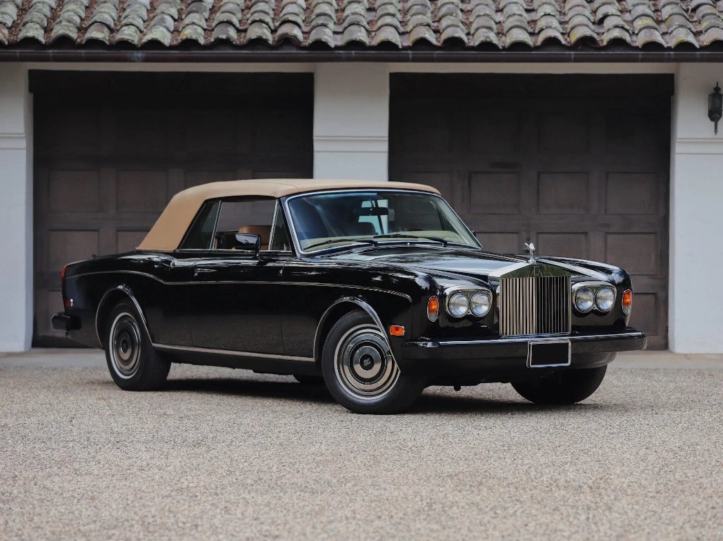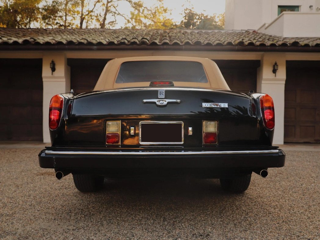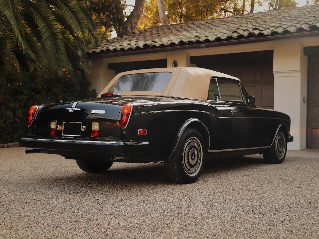 This 1986 Rolls-Royce Corniche II is finished in black over tan leather upholstery and is powered by a 6.75-liter V8 paired with a three-speed automatic transmission. Equipment includes a tan soft top, 15″ wheels, a waterfall grille, automatic climate control, cruise control, drink cabinets, an AM/FM/cassette stereo, and power-adjustable front seats.
