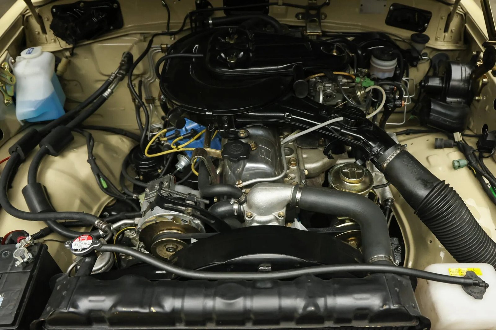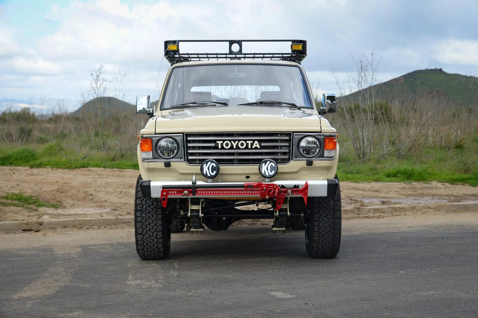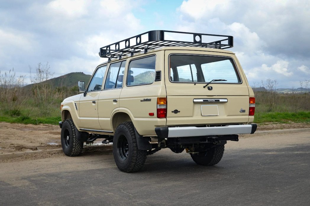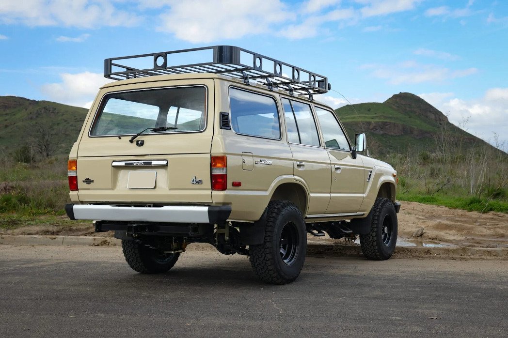 This 1986 Toyota Land Cruiser FJ60 was refurbished by Legacy Overland. Work included stripping and coating the frame, rebuilding the 4.2-liter 2F inline-six, four-speed manual transmission, and two-speed transfer case, overhauling the suspension and brakes, refinishing the exterior in Desert Storm Tan, and retrimming the interior in distressed brown leather with Harris Tweed tartan inserts. The truck is equipped with a 2″ suspension lift, Old Man Emu shocks, manually locking front hubs, front disc brakes, 15″ steel wheels, 33″ BFGoodrich tires, LED lighting, a roof basket, air conditioning, and a digital media receiver linked to a JBL sound system.