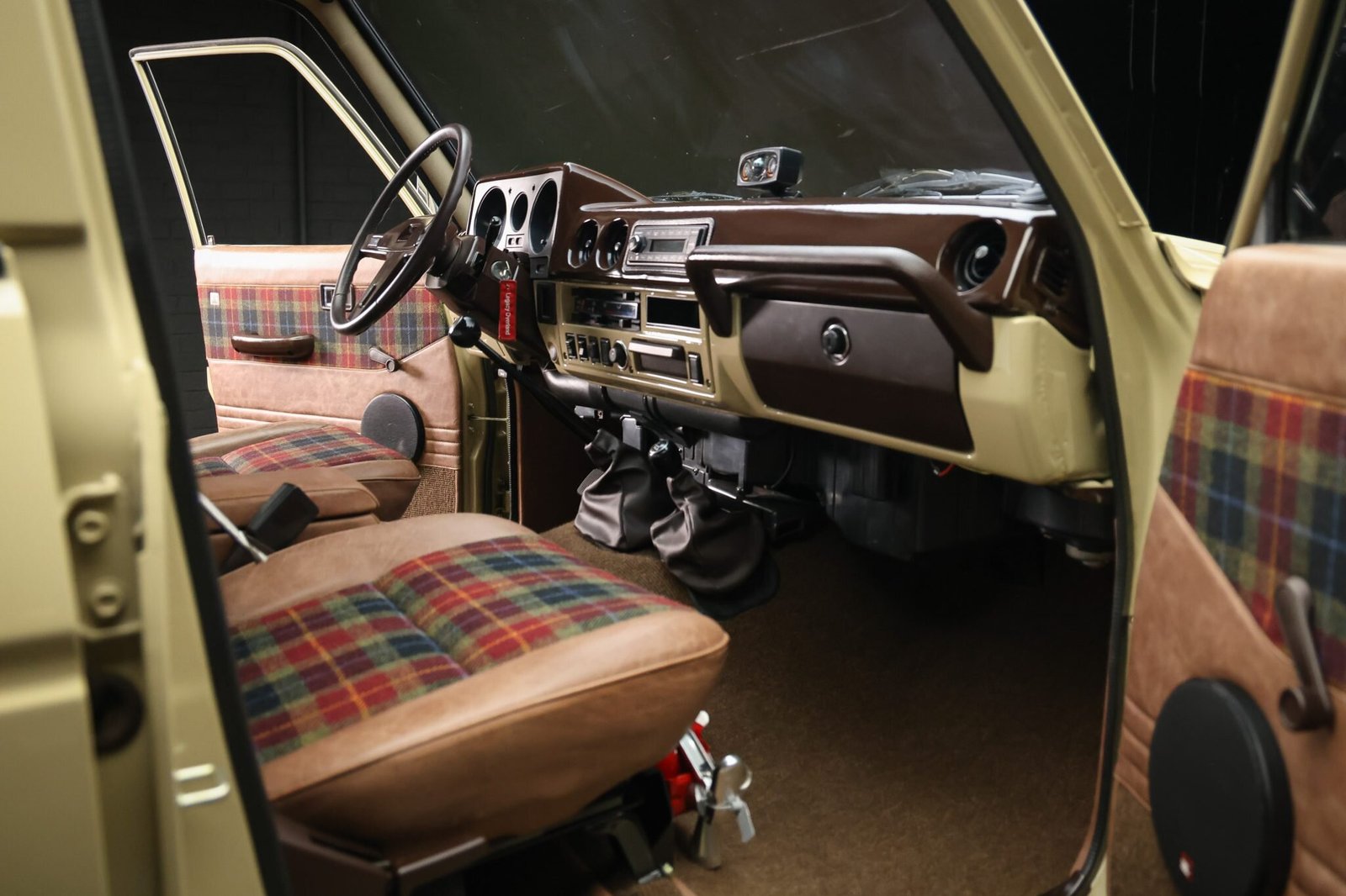 The front bucket seats and folding rear bench are upholstered in distressed furniture-grade brown leather and Harris Tweed tartan inserts that extend to the door panels. German square-weave carpets line the floors, and appointments include air conditioning, crank windows, a center console, a fire extinguisher, and a Bluetooth-capable Continental digital media receiver linked to an eight-speaker JBL sound system with a subwoofer.