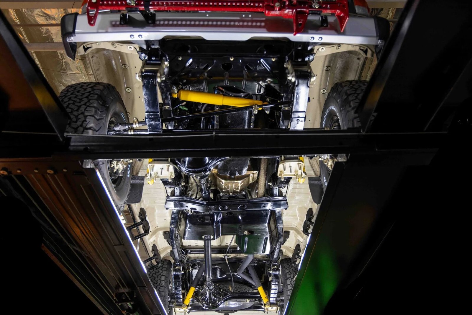 The rebuilt 4.2-liter 2F inline-six is equipped with a single carburetor and was factory rated at 135 horsepower and 210 lb-ft of torque. Power is delivered to the rear or all four wheels through a four-speed manual transmission and a two-speed transfer case, both of which were rebuilt during the refurbishment.