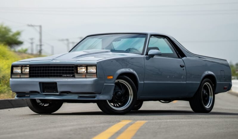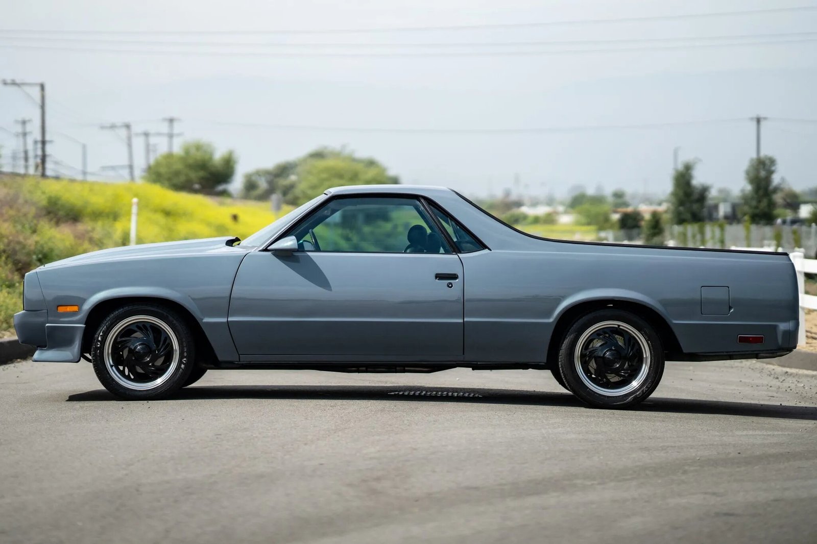 This 1987 Chevrolet El Camino has been modified with a repaint in Honda-specification Sonic Gray Pearl as well as installation of a 6.0-liter Vortec V8, a 4L65E four-speed automatic transmission, and an Eaton Detroit Truetrac limited-slip differential. It is also equipped with a front spoiler, a cowl hood, black-finished 17″ Eagle Alloy wheels, Bilstein shocks, power-assisted four-wheel disc brakes, and a Moser Engineering differential cover and axles as well as a Speedmaster intake manifold, JEGS fuel rails, a K&N cold-air intake, an aluminum radiator, a dual-exhaust system, a B&M shifter, and a Bluetooth-capable touchscreen stereo.