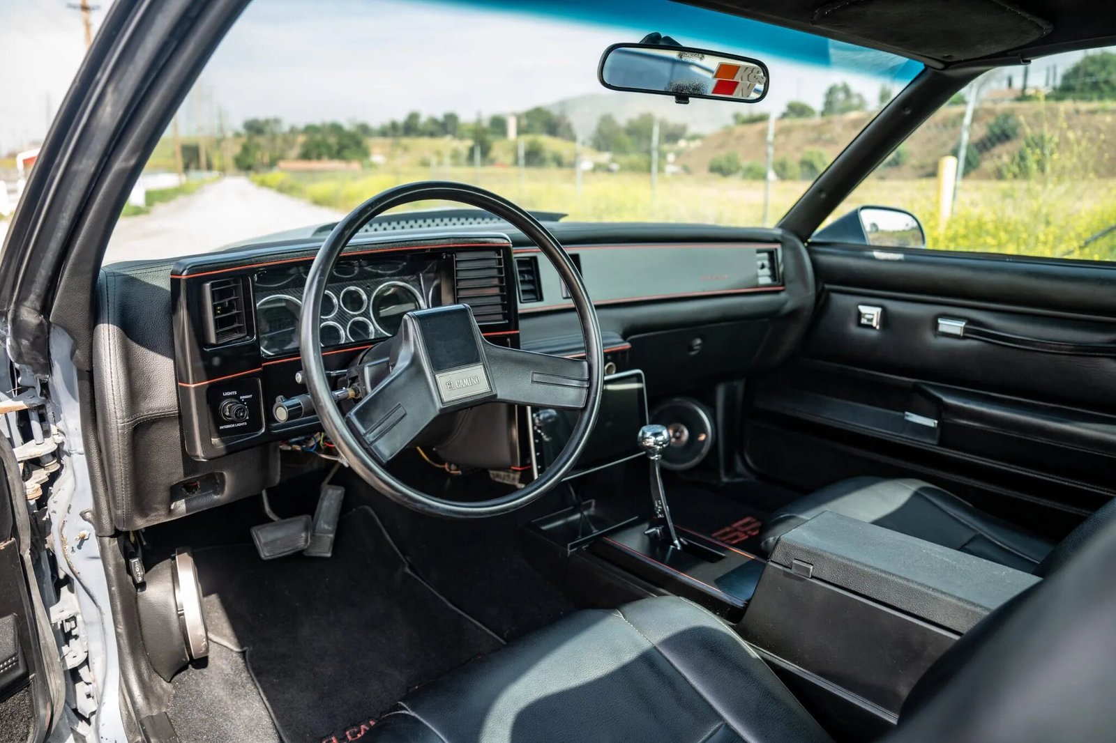 The bucket seats are upholstered in black and accompanied by a color-coordinated dashboard, door panels, and carpets.