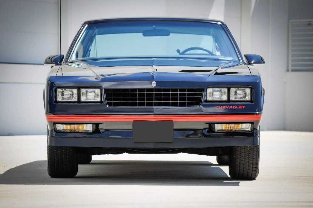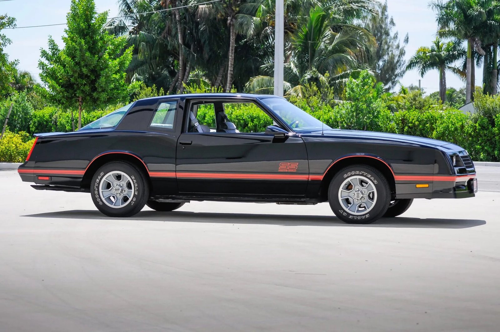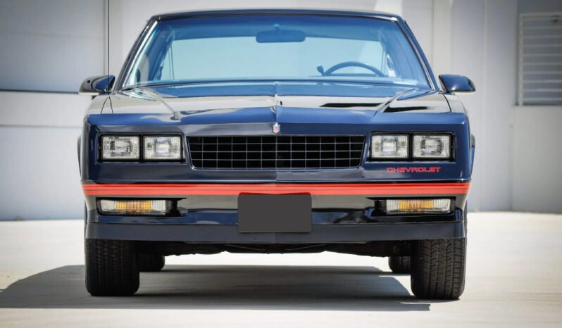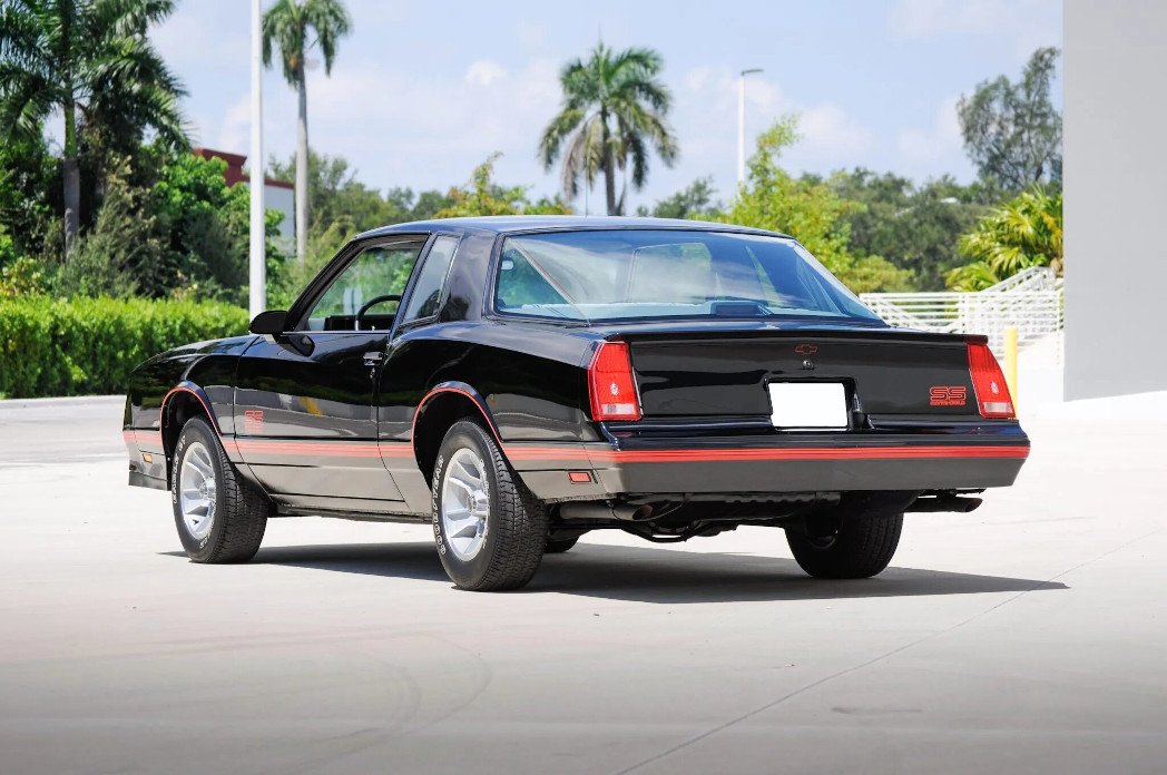 The Aerocoupe version of the Monte Carlo SS was debuted for the 1986 model year and was sold for NASCAR homologation. Compared with the standard body, the Aerocoupe features a sloped rear window and a flatter trunk lip spoiler. Approximately 6,050 Aerocoupe models were built for 1987. The exterior of this example is finished in black and features SS-specific front and rear fascias, body-color side mirrors, “Monte Carlo SS” decals, and dual exhaust outlets.