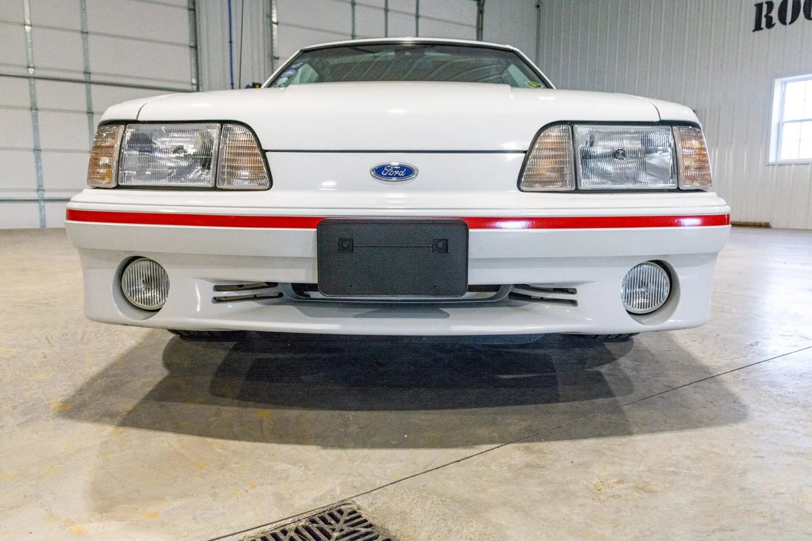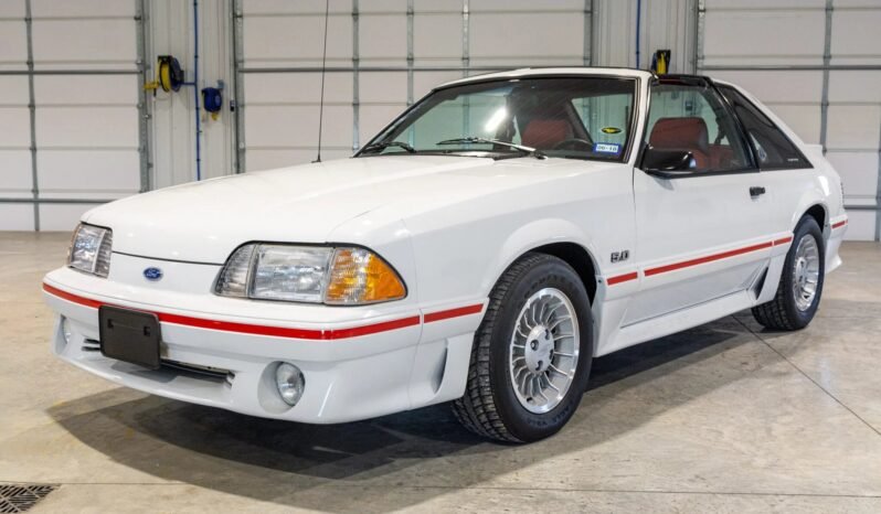 This 1987 Ford Mustang GT 5.0 is finished in Oxford White over a Scarlet Red cloth interior.