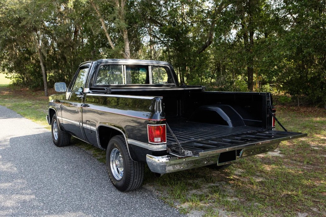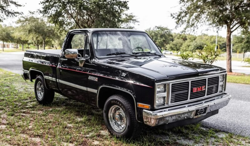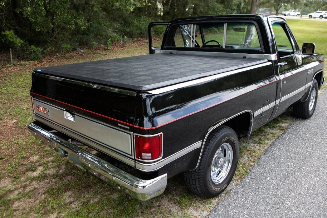 This 1987 GMC R1500 Sierra Classic is powered by a 5.7-liter V8 paired with a three-speed automatic transmission and is finished in black over gray cloth and vinyl upholstery. Appointments include a tonneau cover, a sliding rear window, red pinstriping, bright trim, chrome bumpers, 15″ chrome-plated wheels, aftermarket taillights, dual fuel tanks, air conditioning, and a push-button cassette radio.