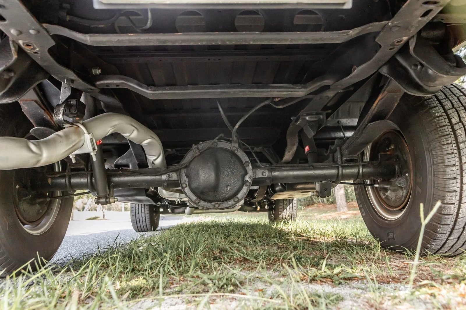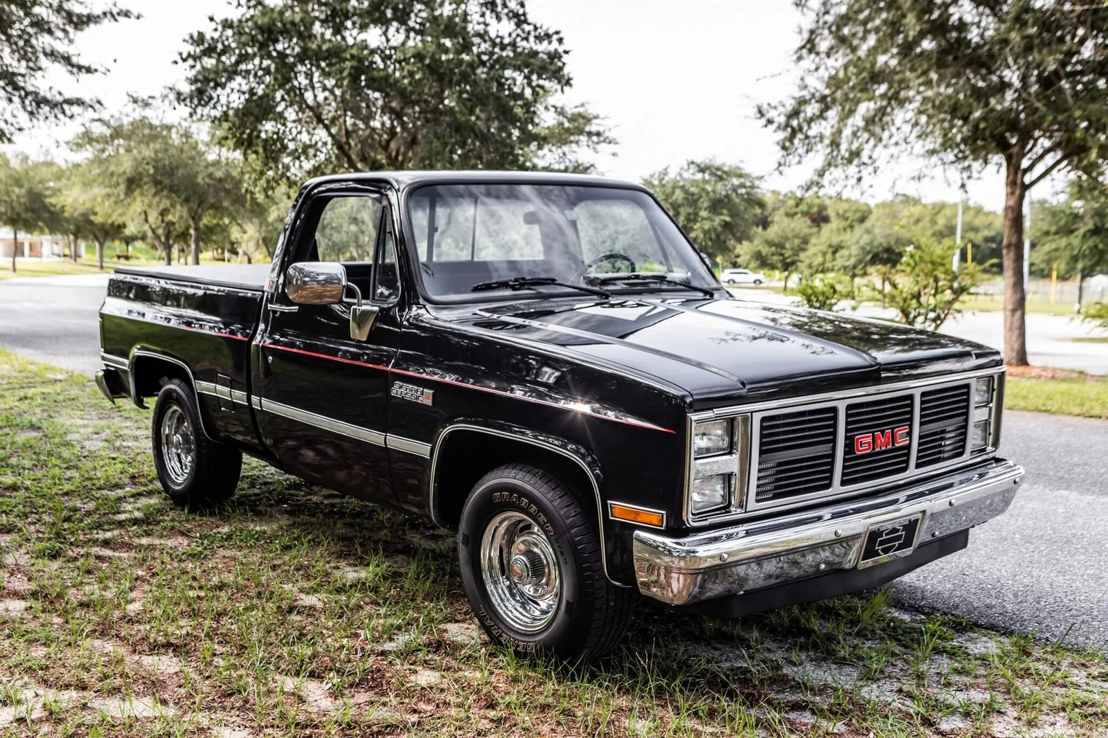 Chrome-plated 15″ rally-style wheels with GMC covers are mounted with 255/70 General Grabber HTS60 white-letter tires. Stopping power is provided by front disc and rear drum brakes.