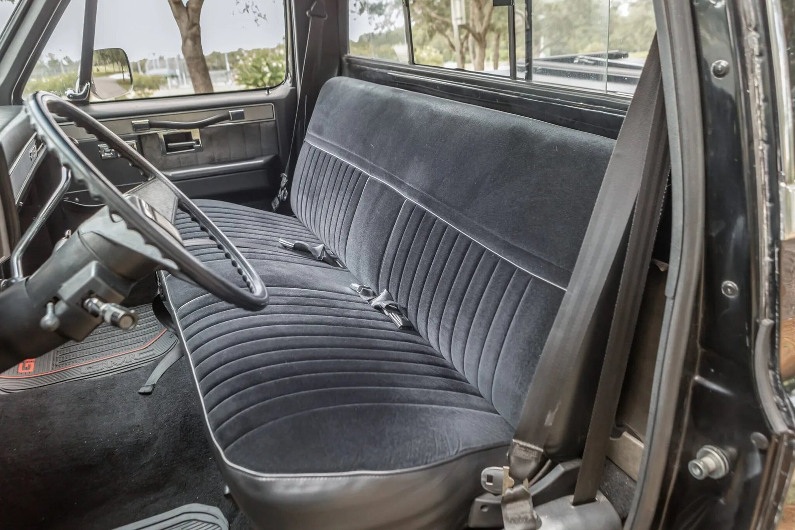 The folding bench seat is trimmed in gray cloth and vinyl upholstery and is accompanied by a color-matched dashboard and carpeting. Appointments include air conditioning, door map pockets, power windows and locks, GMC-logo rubber floormats, and a push-button cassette radio. The seat cover and carpet have been replaced.