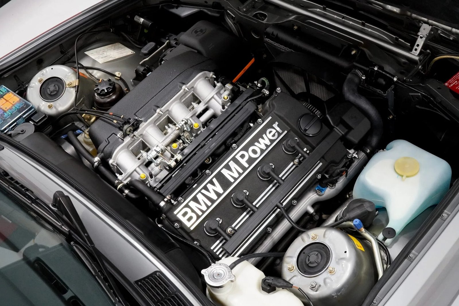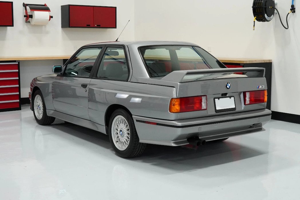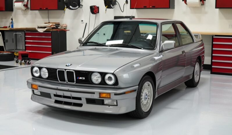 This 1988 BMW M3 is powered by a 2.3-liter S14 inline-four paired with a five-speed manual transmission and a limited-slip differential, and is finished in Salmon Silver Metallic over black leather.