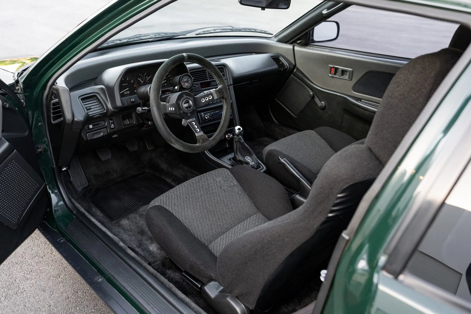 The air conditioning has been removed, and equipment includes wind-up windows, a suede-wrapped Sparco L777 steering wheel, a Sparco shift boot, a Sony CD stereo, rear storage compartments, and a Viper alarm system.