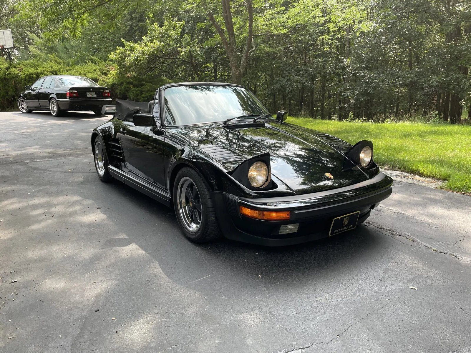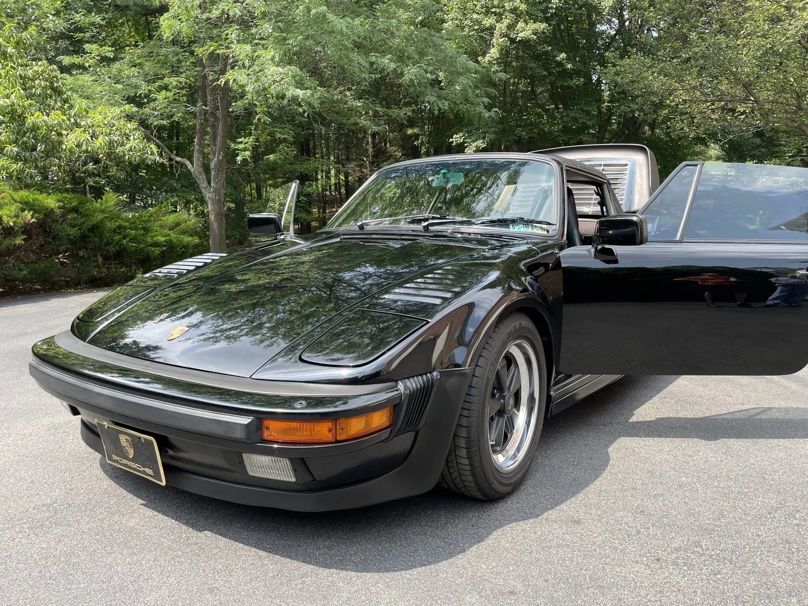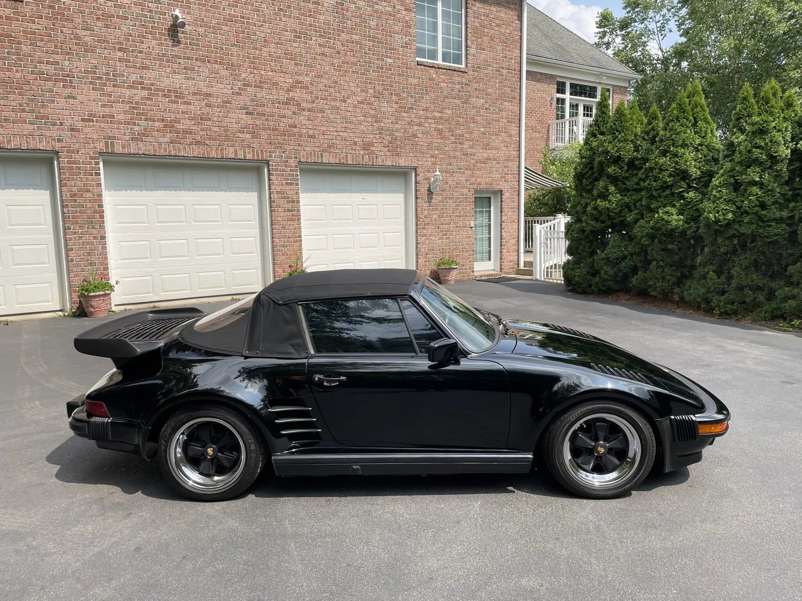 This 1988 Porsche 911 Turbo cabriolet came equipped from the factory with M505 flachbau bodywork and is powered by a turbocharged 3.3-liter flat-six paired with a four-speed manual transaxle. It is finished in Black over Black leather and is equipped with 16″ Fuchs alloy wheels, a limited-slip differential, four-wheel cross-drilled and ventilated disc brakes, a black soft top, heated power-adjustable sport seats, a 930S steering wheel, and air conditioning.