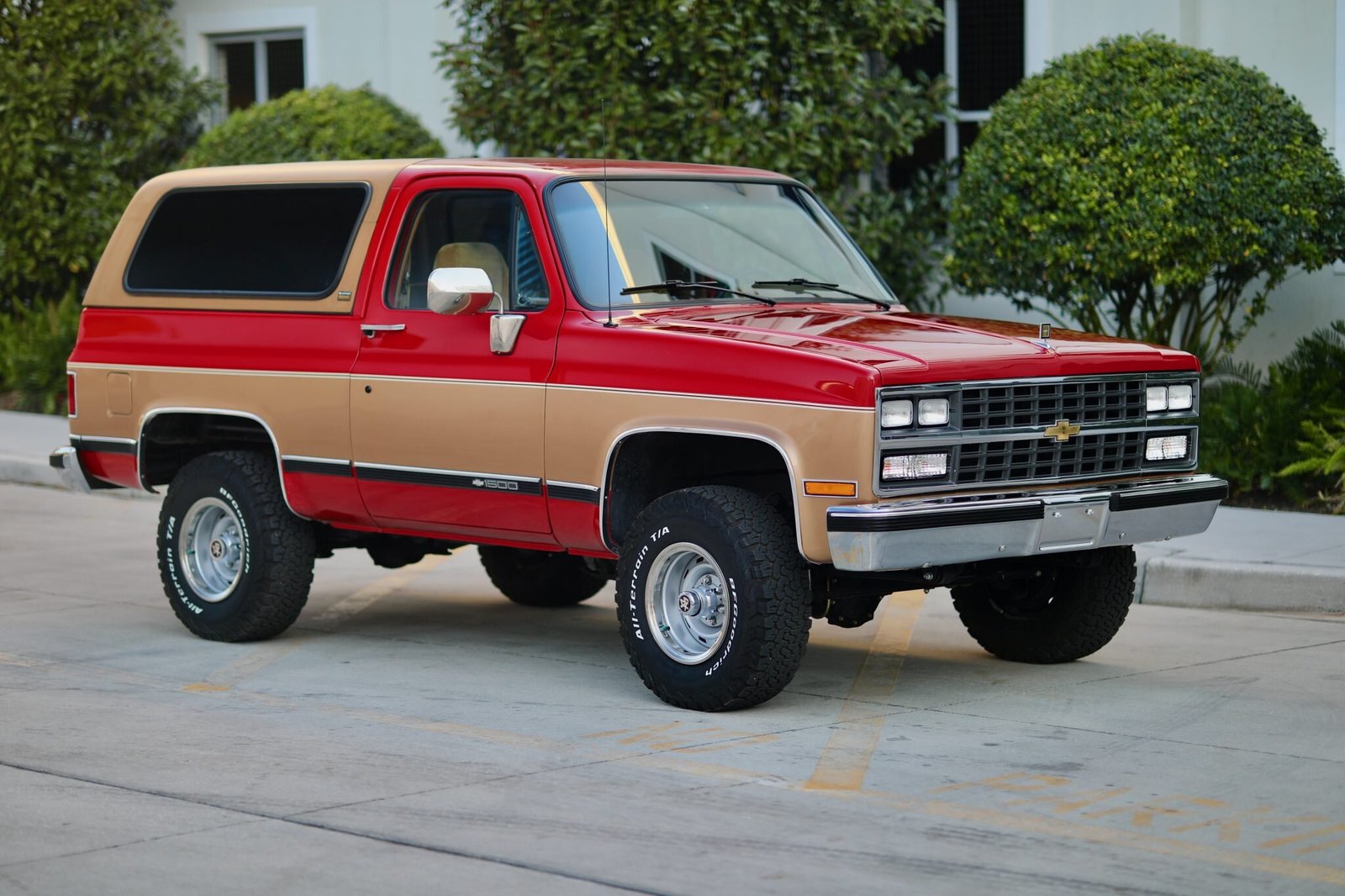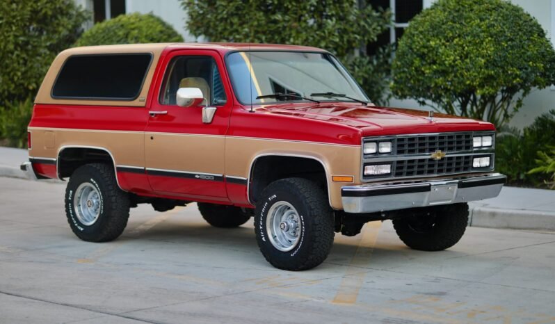 This 1989 Chevrolet Blazer Silverado 4x4 is finished in two-tone Fire Red and Sunset Gold over tan cloth, and power is provided by a fuel-injected 350ci V8 mated to a four-speed automatic transmission with overdrive and a two-speed transfer case. Equipment includes a removable gold hardtop, an AM/FM cassette stereo, air conditioning, silver-finished 15” wheels with polished trim, power windows, and power-assisted steering and brakes.