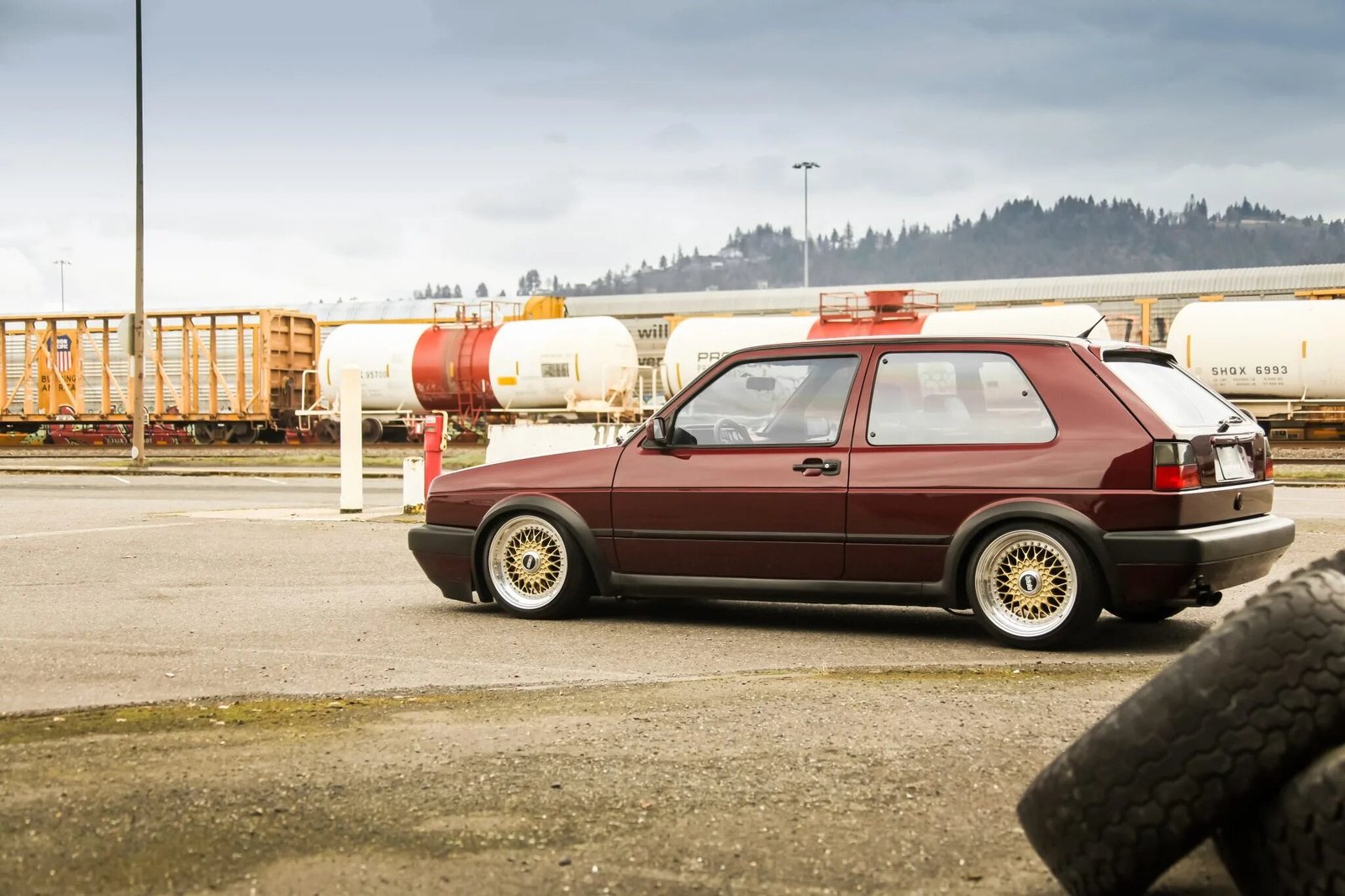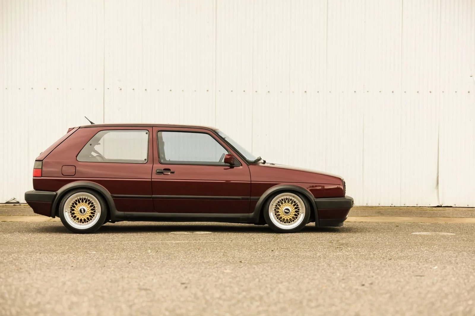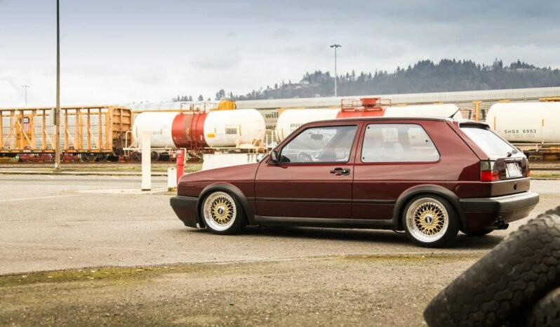 This 1989 Volkswagen Golf GTI 16V is a modified example that is finished in burgundy over black and gray and powered by a turbocharged 1.8-liter inline-four paired with a five-speed manual transaxle.