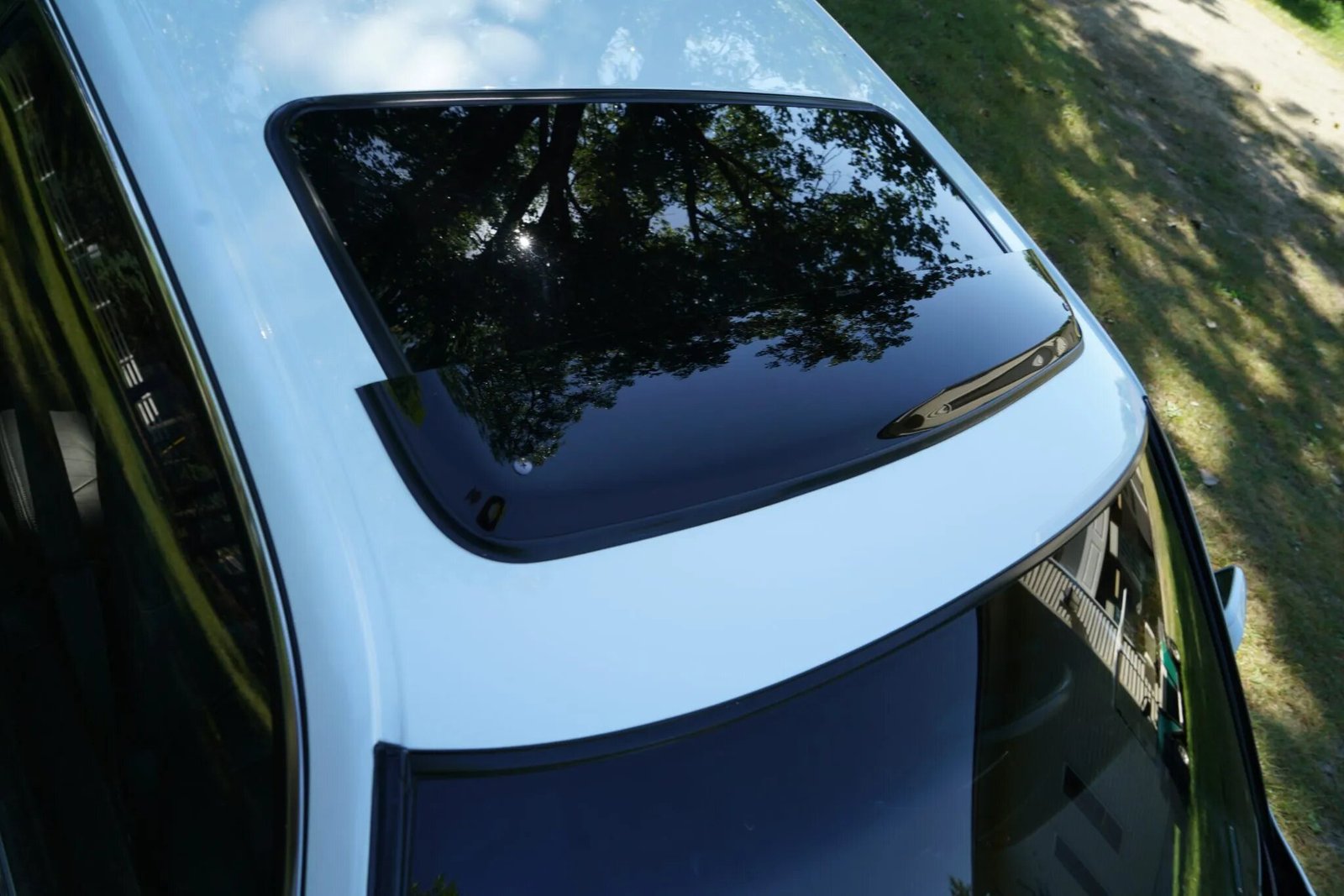 The car is finished in Sirius White Pearl (NH-515P) with Asturias Gray Metallic (NH-502M) accents and black side moldings. Equipment includes a powered glass sunroof, bright window trim, fog lights, front and rear mudguards, and twin exhaust outlets.