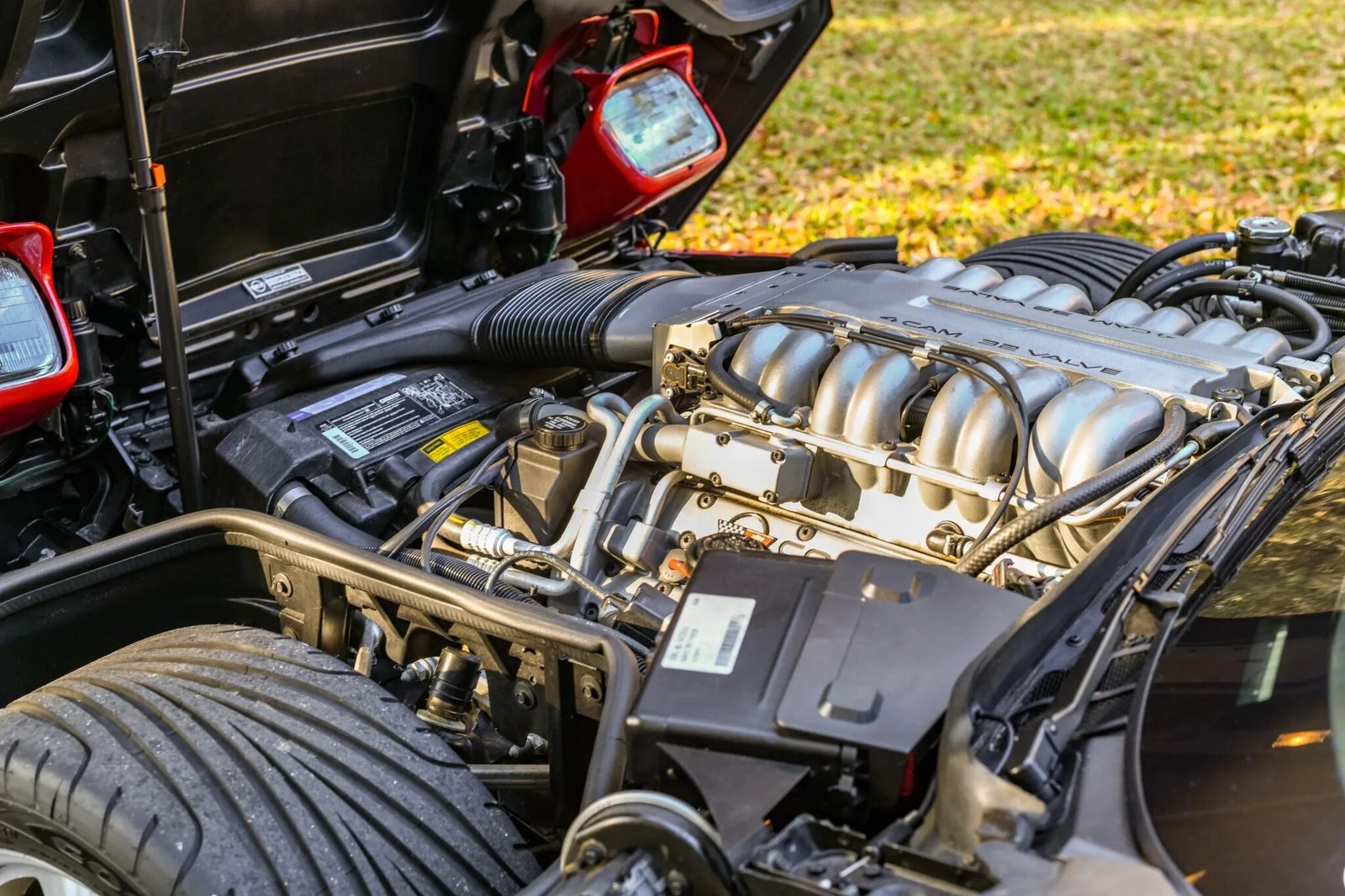 It is powered by a 5.7-liter LT5 V8 paired with a ZF six-speed manual transmission and is finished in Bright Red over red leather.