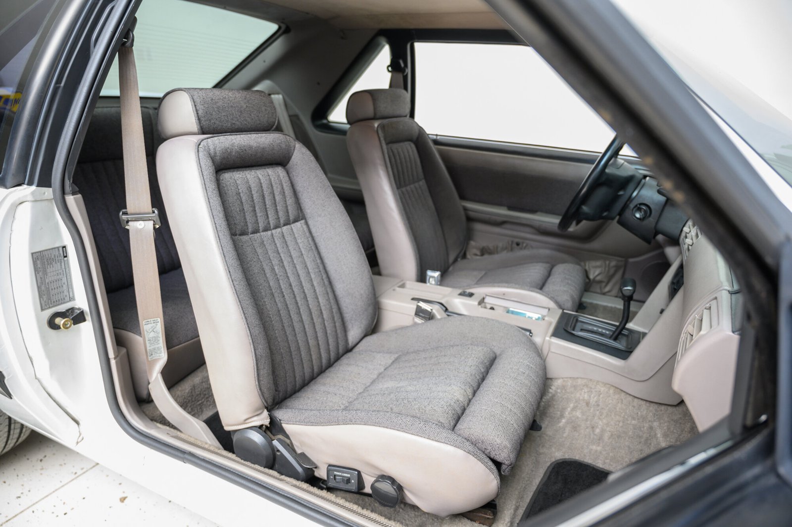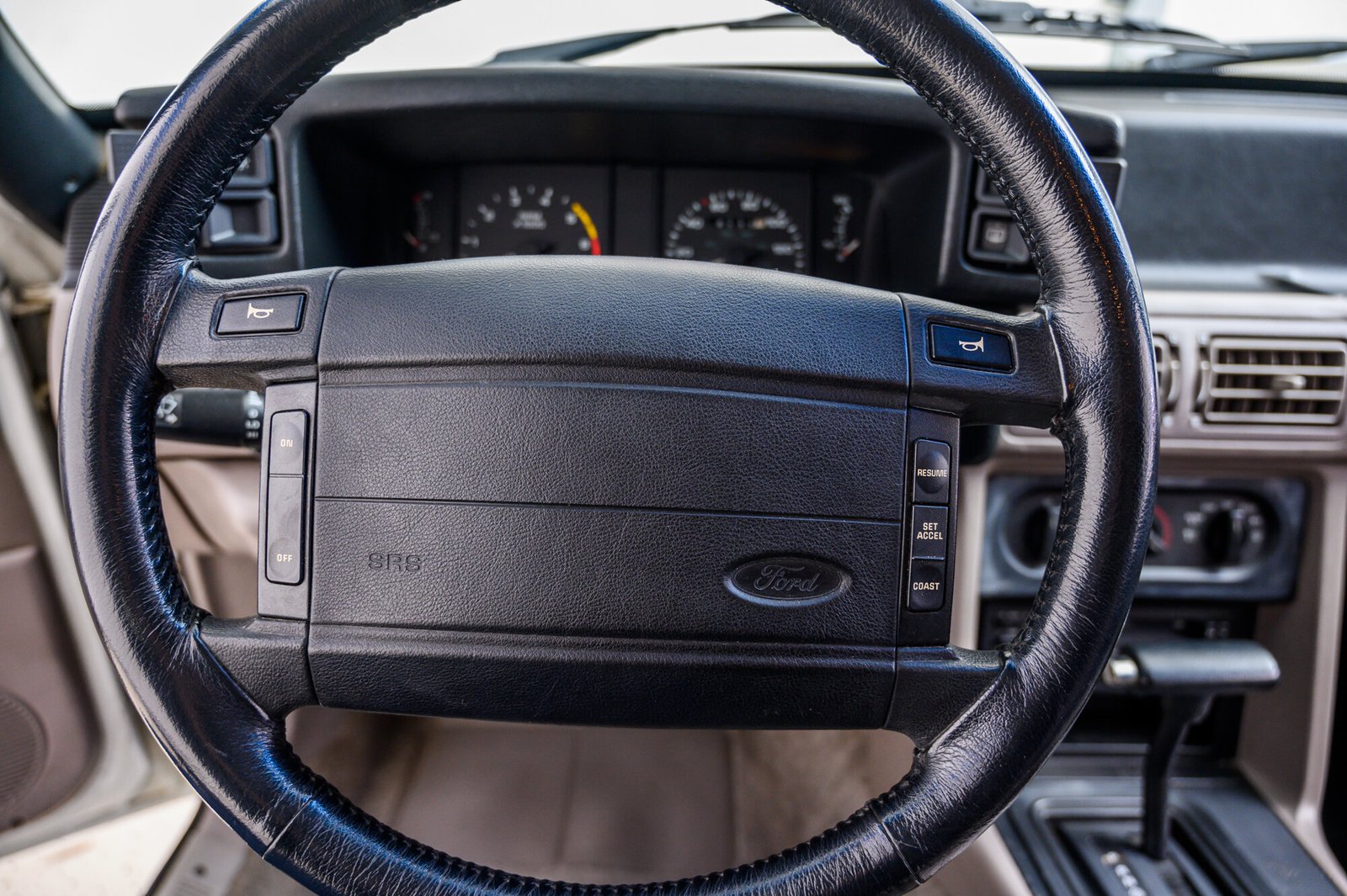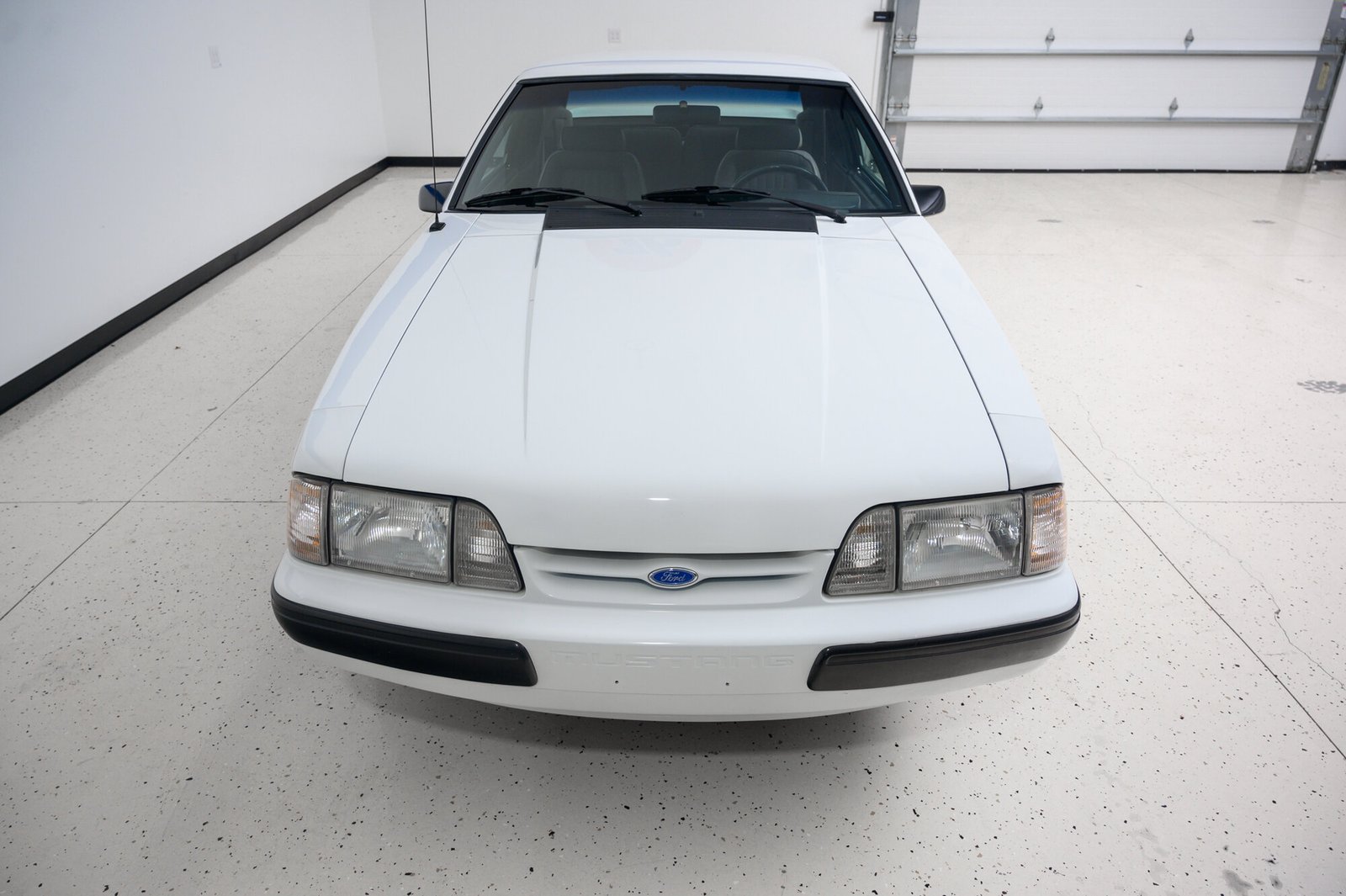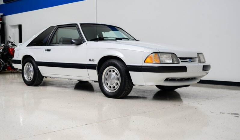 This 1990 Ford Mustang LX 5.0 hatchback is finished in white over a gray cloth and vinyl interior, the car is powered by a 5.0-liter V8 paired with a four-speed automatic transmission. Equipment includes power windows and locks, a cassette stereo, cruise control, and a dual exhaust system.